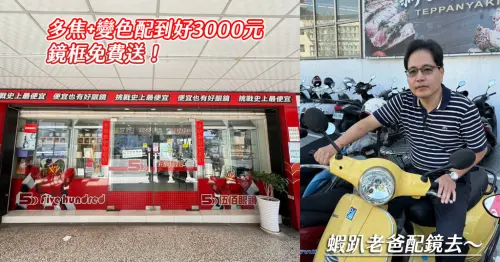 「伍佰眼鏡」新店外觀設計簡潔有力,以鮮紅色系招牌搭配白色字體,從馬路對面就能一眼認出。玻璃門設計加上柔和燈光,營造出明亮且現代感十足的氛圍。門口還掛有優惠布條,「兩人同行配鏡一人免費」、「多焦配到好只要2500」,讓人經過很難不多看兩眼!