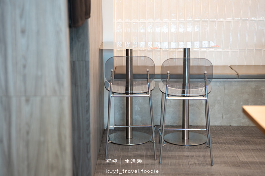 灰色系牆面呈現極簡美學感,木色桌椅搭配白色座椅,利用落地窗形成連貫立面導引自然光。