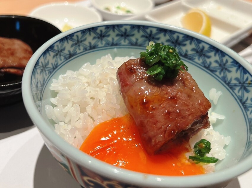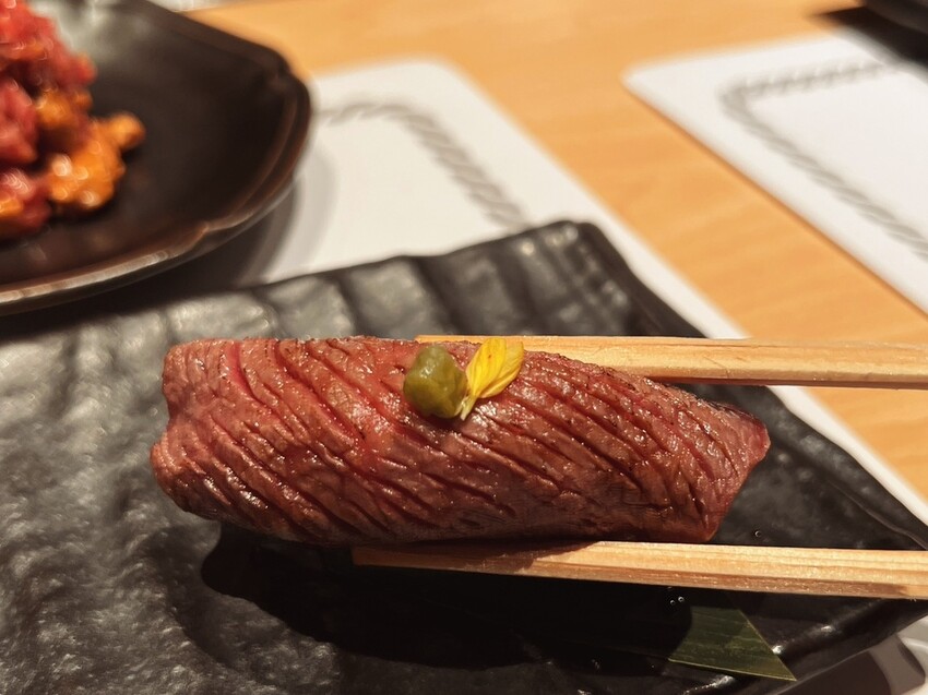 進入店內,黑色與木質的裝潢設計融合了現代與傳統,給人一種低調奢華的日式感受。店內設有吧台區,讓您可以享受到料理的視覺饗宴,而後面的座位區空間也比較寬敞,很適合帶孩子或多人用餐,若想保有完全的隱私,則可選擇需加價三千元的包廂區。入座後,桌上會擺放日式醬汁、檸檬、鹽等燒肉沾醬,服務人員也會親切地介紹餐點,有時候還能幸運品嚐到店家招待的鹿兒島壽喜燒試吃。菜單上,海膽鮭魚卵壽司令人驚豔,口感甜美毫無刺激感,搭配生牛肉的柔嫩,簡直是完美組合。另一道超吸睛的A5生醃日本和牛,巧妙地用甜筒盛裝,裡面還藏了一顆生雞蛋,捏碎後與荷蘭醬、奶油、芥末籽拌勻,生和牛吃起來軟嫩滑順,口感層次超豐富。前菜三品包括大阪直傳涼拌豆芽、主廚特製生醃泡菜,泡菜爽脆甜辣又開胃,以及A5日本和牛炙燒壽司,肉汁與醋飯融合更是美味。本日精選沙拉搭配蘋果油醋醬,酸甜清爽格外開胃。飲品方面,可選擇口感輕盈細膩的日本清酒飛露喜,或是清爽解膩的草莓氣泡飲,還能吃到滿滿的果肉。