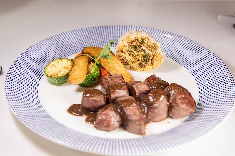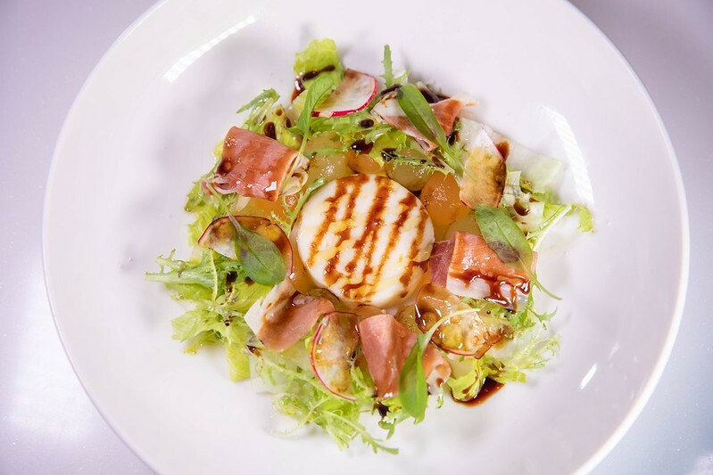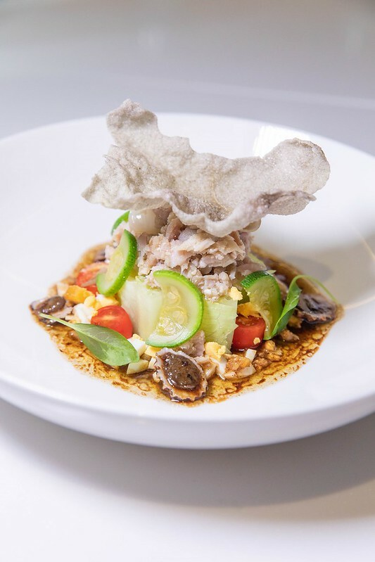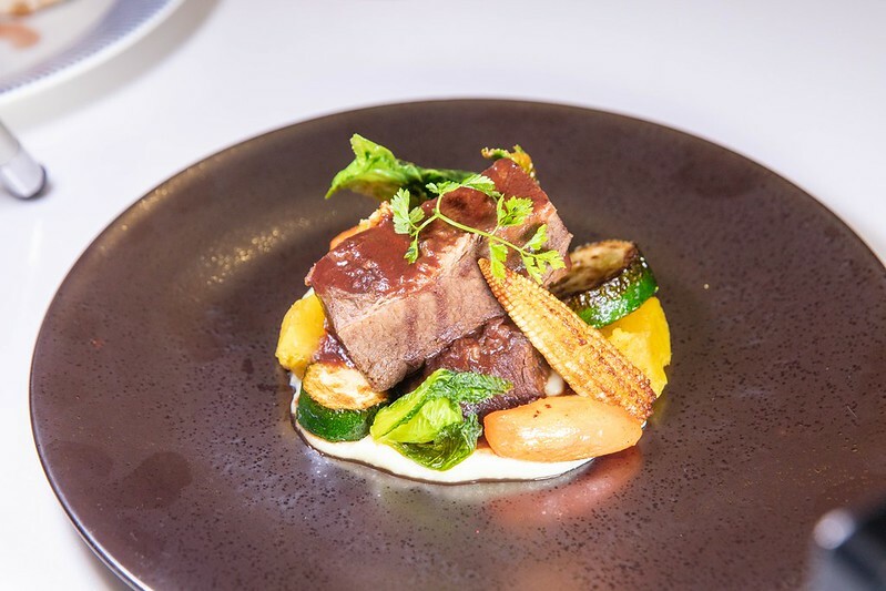 島嶼尼斯沙拉以台灣東部豐富的海鮮與當季蔬果搭配,口感與味道層次豐富,帶有些許探索食材的樂趣。法式前餐怎能少了淡菜,這裡的ESG經典白酒淡菜選用台灣馬祖的鮮美淡菜,白油增添香氣,蒜香與九層塔完美附著於甜美的淡菜上,讓人忍不住一口接一口。火腿蜜瓜起司盤擺盤如花園般精美,佐以橄欖油與油醋帶出味覺前奏,搭配火腿的油甜、蜜瓜的清甜,還有令人印象深刻的整顆干貝,簡直是畫龍點睛。佛卡夏與西班牙炒白蝦的組合,佐以辣油,風味十足,白蝦脆彈,裹滿西班牙辣椒粉的油香與辣味,搭配入味的蘑菇與鮮甜番茄,風味對比鮮明。秋意濃蟹肉餅則以圓舞曲般夢幻的擺盤呈現,炸蟹肉餅酥軟外衣包裹著札實軟綿蟹肉,沾取黃色醬汁,更顯圓融鮮美,台灣水果與蔬食的盤飾也為每口蟹肉餅增添趣味。