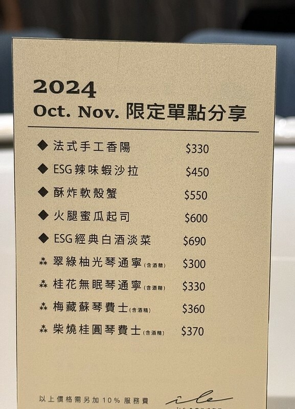 Île 島嶼法式海鮮位於文山與新店交界處的靜謐巷弄內,充滿一絲神祕感,正如主廚的料理,總引人無限遐想。一踏進門,映入眼簾的是一片藍色海洋的風景,包廂裡的小島畫作栩栩如生,右側則是半開放式的透明廚房,整體氛圍給人一種溫暖與熟悉感。現在,餐廳的點菜模式更加彈性,除了套餐選項,也增加了單點菜色,讓顧客能更自由地選擇。這裡的前菜、湯品價格約在三百元左右,主餐也不過七百元,相較於其他法式餐廳,價位顯得十分平易近人。新一季的料理更融入了餐酒元素,調酒基底選用台灣琴酒,例如花蓮「醲蒸餾所」的柚香烏龍琴酒,調製出的桂花無眠琴通寧,入口時帶有淡淡的柚香與酒甜,茶香餘韻,非常順口。