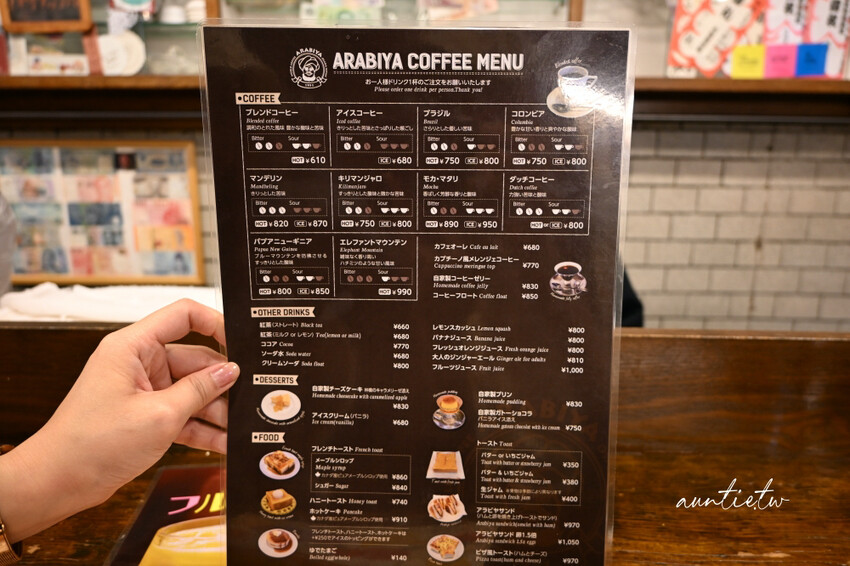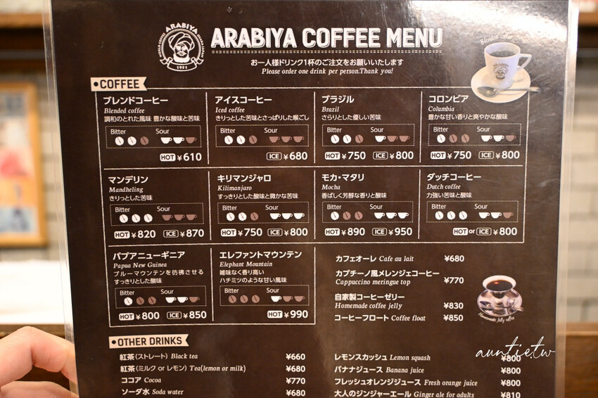 他們家的自家製焦糖布丁,份量算是蠻大一顆的,口感雖然不是那種非常軟嫩到入口即化的,但它的香味真的超級濃郁,仔細看還能看到布丁裡頭有黑黑的香草籽,蛋香更是十足。焦糖醬搭配布丁的風味很棒,吃起來不會太甜,還帶有一點點微苦的焦糖香氣,真的非常優秀,難怪這麼多人為了它而來,完全沒讓人失望。值得一提的是,這家Arabiya Coffee是禁菸的,不像大阪京都有些老咖啡廳還能抽菸,想好好享受一杯咖啡和舒適的環境,這裡真的很可以。