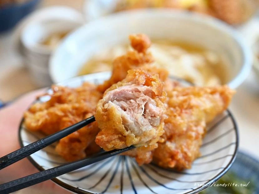 主角唐揚炸雞採用雞腿肉,醃過之後再裹粉下去炸至金黃色澤,外皮酥脆不油膩,裡頭的肉質更是鮮嫩多汁,每一口都超juicy