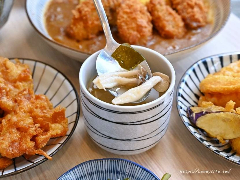 定食均會附上小菜及味噌湯,湯頭濃厚,裡頭還可以吃到香甜的蕈菇及海帶