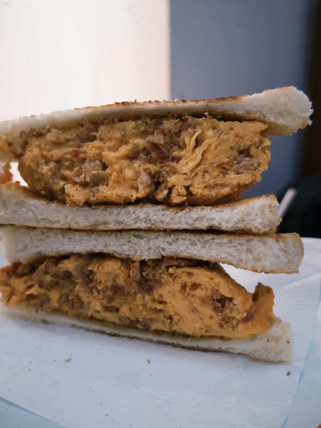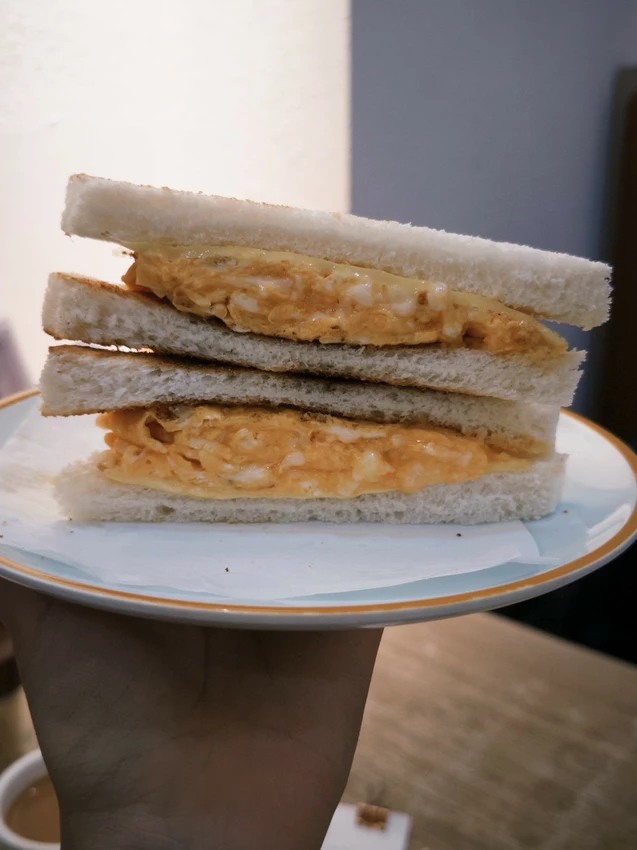 它的餐吐司有特別烘底,吃起來微脆 。裡面包裹著滑嫩的炒蛋和香氣四溢的鹹牛肉 。蛋香跟牛肉的油脂香氣完美融合在一起,口感濕潤又滿足,每一口都充滿了飽滿的港式靈魂 。