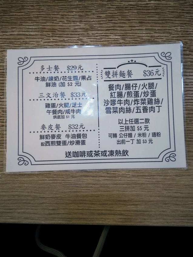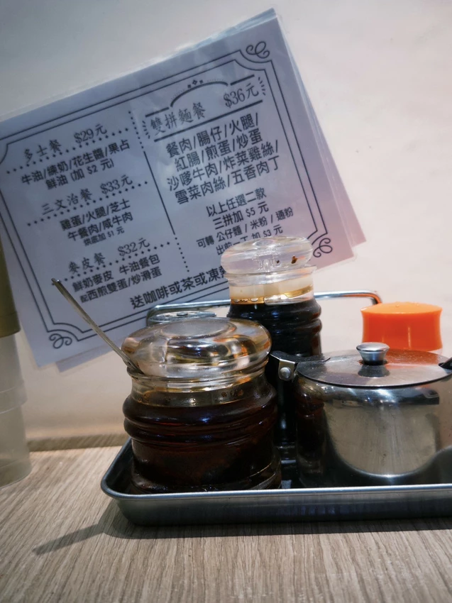 搭配嫩滑的牛肉片,每一口都鹹香入味,油香四溢,口感非常棒。價格也很親民,像三文治餐選兩種料,還會送咖啡、茶或凍飲,只要港幣三十三塊。如果想烘底,多加一塊錢港幣 。雙拼麵餐則是港幣三十六塊。