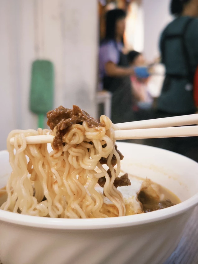 麵條煮得剛剛好,吃起來滑溜又彈牙,而且吸附滿滿的沙嗲香氣 。