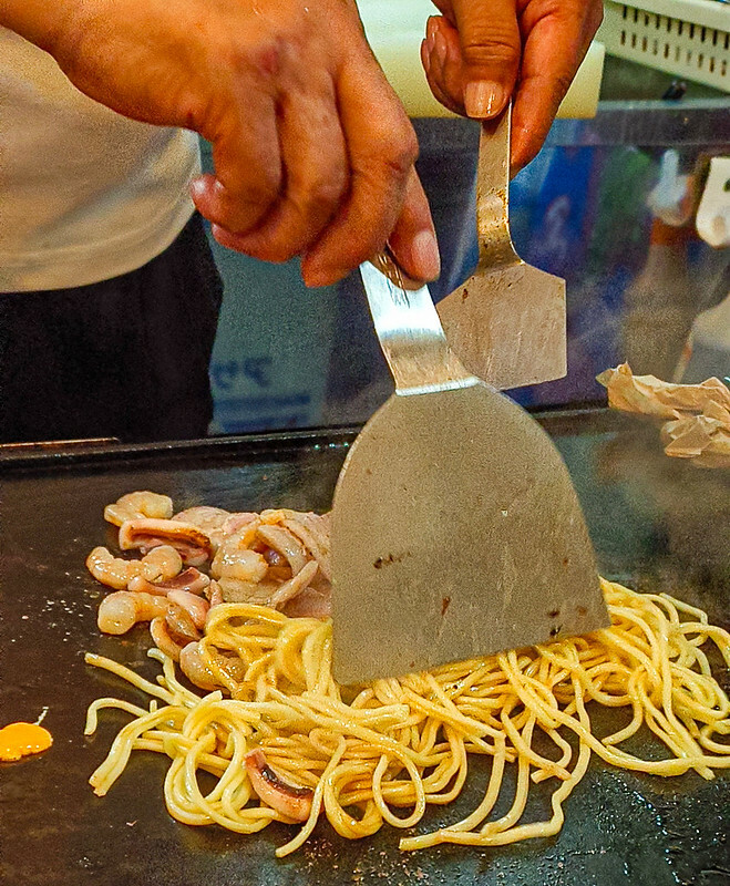 用餐期間,還遇到一位中國女生點了炒麵,同樣是料多實在,蝦子和章魚都給得很多,看起來雖然鹹了點,但料理過程散發出的香氣真的讓人難以抗拒。總體而言,「あまから亭」的老先生非常客氣,提供著好吃又便宜的料理,雖然是當地人習慣的家常風味,但對於外國客人來說,普遍給予高度評價,讓人吃得非常愉快。