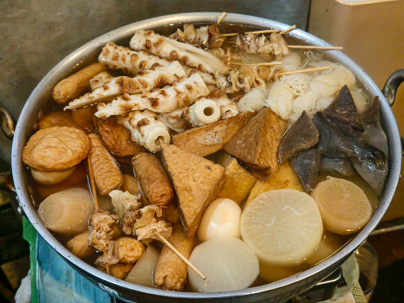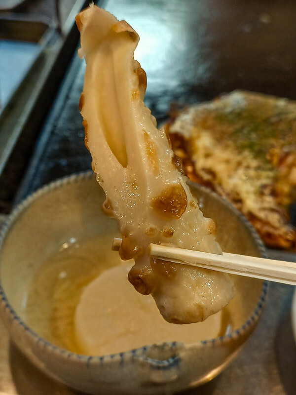 這次用餐,我們點了一份綜合大阪燒,看到老闆在鐵板上熟練地料理就讓人食欲大開。老闆用料一點都不手軟,滿滿的培根、章魚和蝦子都給得很足,醬料刷好刷滿,很有大阪風情,美乃滋也加得滿滿的,底層還有點微焦,吃起來非常美味。雖然個人覺得它可能不及難波某間二樓的大阪燒,但整體來說還是相當不錯的。中途老闆還熱情地介紹他家的關東煮,我們立刻就點了幾樣來嚐嚐,每樣100日圓。這裡的關東煮也相當出色,不僅食材好,高湯味道也棒,特別是蘿蔔,煮得通透又充滿高湯的鮮甜味,吃起來非常愉快。