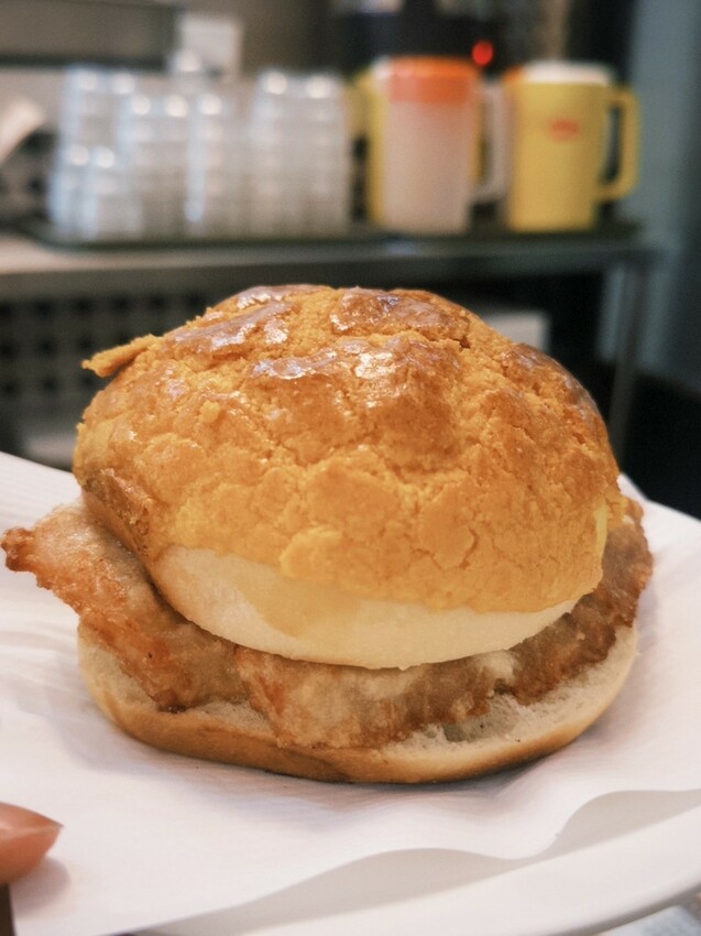 祥興咖啡室的餐點同樣展現了傳統港式風味。其中,惹味豬扒菠蘿包是很多人會點的。菠蘿包會夾著煎到微焦的豬扒,豬肉汁很多也很飽滿。它還會搭配半熟蛋與鹹香的餐肉,一口咬下去層次超級豐富,鹹甜滋味完美交融,真的很好吃。惹味豬扒菠蘿包一份是港幣42元。