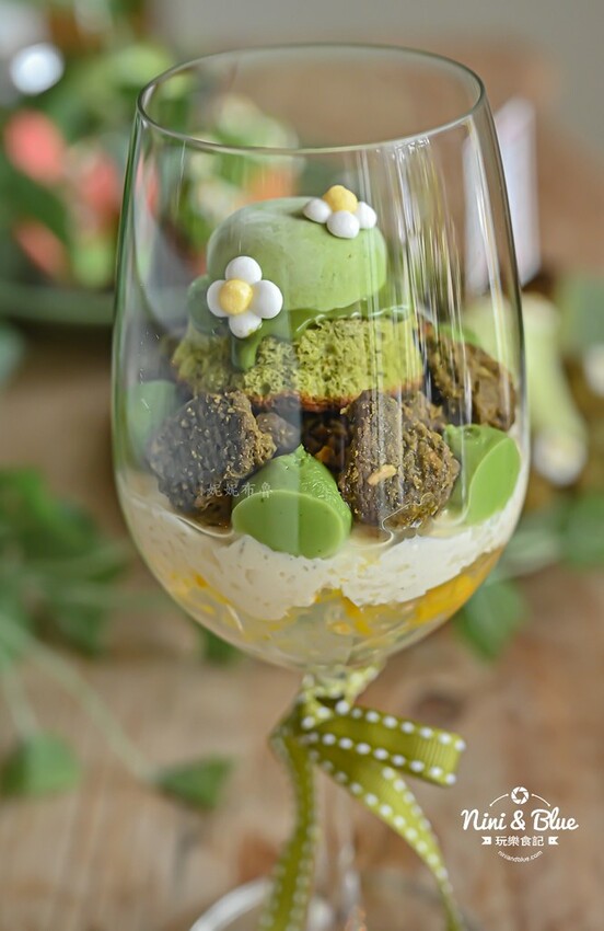 桃太郎旗幟下的是抹茶奶凍,不只有圓滾滾的外型,馬卡龍色調的奶綠閃亮著耀眼光澤,搭配抹茶杏仁頂酥點綴其上,脆口感讓品嚐抹茶奶凍時更有層次。