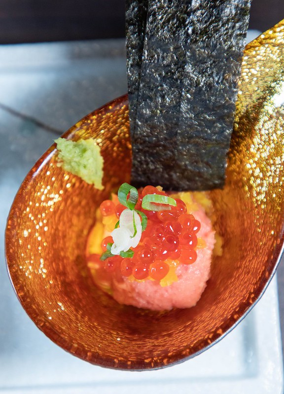 這裡的蟹肉豆腐,上面鋪著真材實料的蟹肉絲,份量給得不少。下面的豆腐據服務生說法是加了蟹黃的蟹黃豆腐,沒有過多的調味,完全是食材新鮮的直球對決。豆腐的化口感增加了蟹肉的絲滑,淡淡的豆香和蟹黃甜味讓兩者的鮮味更加融合。還有這道以鮪魚泥為主體的前菜,你可以用海苔捲起來,搭配鮭魚卵一起吃,有點像自己做鮪魚泥軍艦壽司,是道微奢華的選擇。最特別的是「明太重」,這在台灣幾乎沒見過,就連在日本也很少見。簡單說,它就是把鰻魚飯的概念複製過來,漆器裡鋪上白飯,用博多名產明太子取代鰻魚,再灑上海苔絲。不過,這裡的明太子可不是直接放上去那麼簡單,外面還有一層用柴魚高湯醃漬過的昆布。這讓原本微辣鹹香的明太子多了一個層次的美味,尤其是昆布的鮮味和醃漬後的清爽微酸,會讓人有點愛上。至於牛腸鍋,幸ちゃん一直堅持使用厚切帶油的牛腸,因為沒有油質的腸鍋就不叫腸鍋,這是博多友人的吶喊。他們選用的是比較貴但味道更香更美味的白頭韭菜,而且份量很大把。另外,湯頭裡面還加入了高麗菜和豆腐,讓湯頭變得更清爽,減少了牛腸鍋吃多煮久後可能產生的油膩感。這不僅增加了各種食材間的美味,也讓整個鍋物更為清爽鮮美,畢竟台灣人還是很愛喝火鍋湯。土雞腿肉胡麻豆乳鍋也令人驚艷,裡面有好幾大塊的土雞腿肉,還有雞肉丸子、豆腐,以及大量我個人很喜歡的菇類和高麗菜。這鍋湯頭非常濃郁,胡麻和豆乳的滋味香而不膩,搭配軟嫩卻不失咬勁的土雞腿肉剛剛好,即使煮久了也不會有肉柴的問題。微噴汁的雞肉丸子也很鮮甜,或許是從相撲鍋「跳槽」過來的。整體來說,如果同行朋友不喜歡牛腸的油質,這一鍋應該會很受歡迎,尤其是女性朋友。
