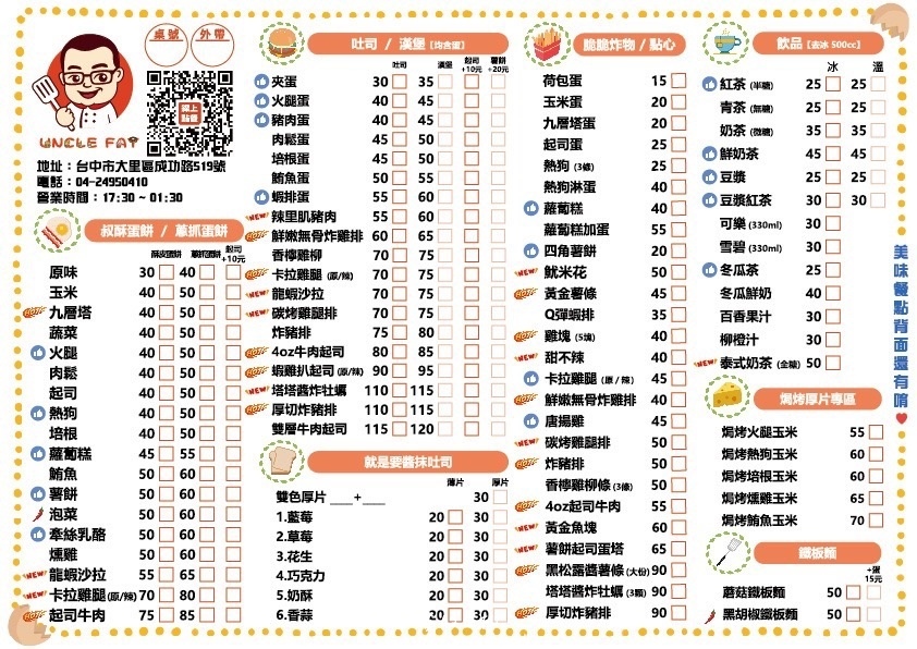 胖叔叔是你的完美選擇,豐富品項,晚餐宵夜都搞定,就在大里成功路等你喔