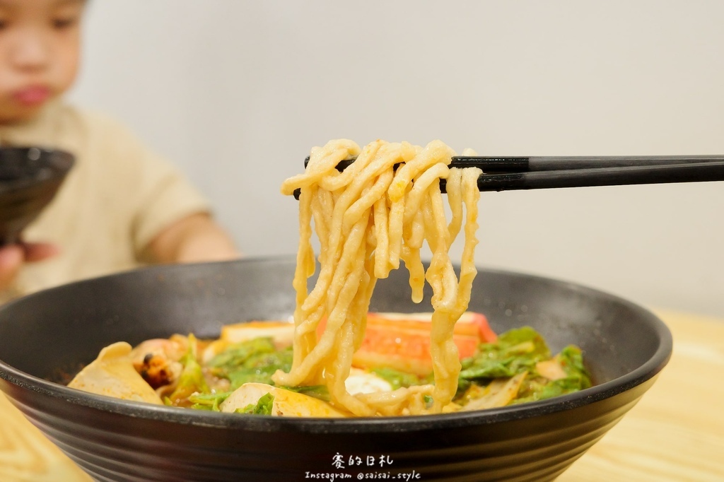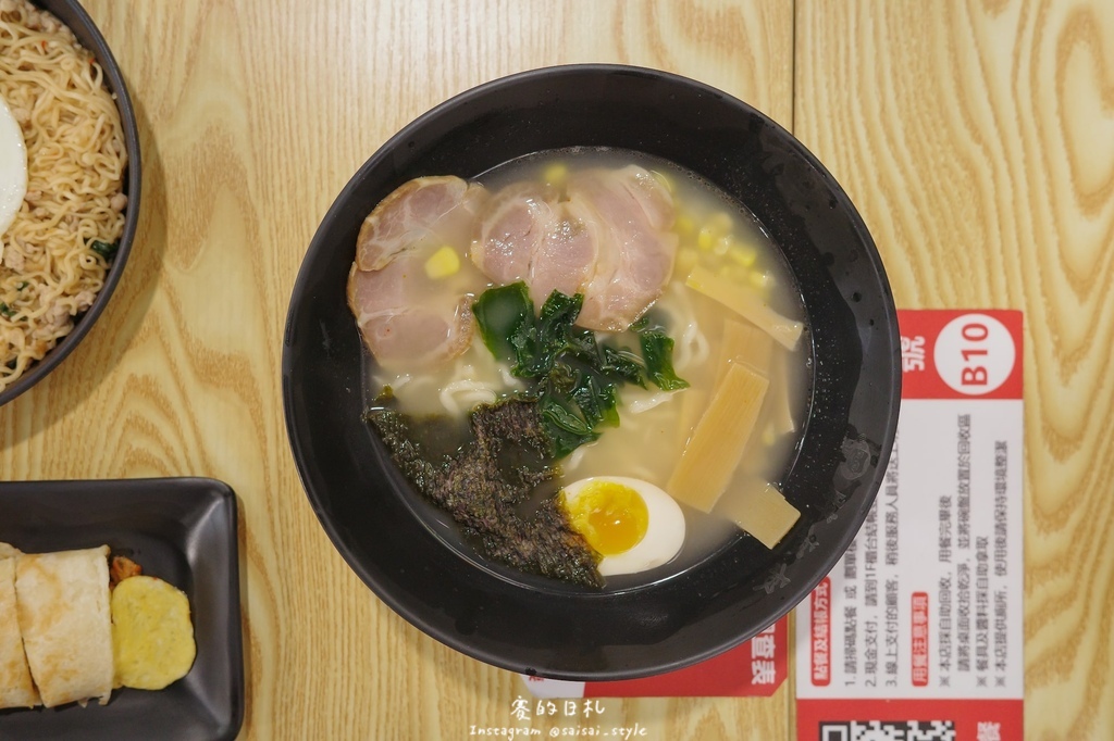 接下來要介紹泰式椰香嫩雞咖哩,這道咖哩飯走的是溫柔系口味,醬汁是那種偏橘色的泰式咖哩,帶著一點點椰奶的香氣。雞肉也給得很大方,整體風味不會太濃重,吃起來非常順口。如果你喜歡吃辣,那這碗麻辣鴨血豆腐鍋燒意麵絕對會讓你超級滿足。它的湯頭麻而不死辣,香氣十足,裡面有鴨血、豆腐、各種火鍋料、還有蔬菜,當然還有一顆蛋,配料真的非常豐富。我選擇了意麵,因為它很容易吸飽湯汁,所以每一口都充滿辣香,非常適合當宵夜。豚骨拉麵也是必點,這碗豚骨拉麵的湯頭超級有誠意,喝起來有那種日本拉麵的鹹香風格,味道偏重但卻不會膩。麵條煮得剛剛好,非常Q彈,搭配叉燒、糖心蛋、海苔、玉米和筍乾等配料,整體搭配非常完整。叉燒片給得不小塊,口感是嫩中帶有咬勁的。如果喜歡重口味的朋友,那這道打拋豬肉炒泡麵一定要點來試試看。麵條炒得恰到好處,不會軟爛,還保有那一點點彈性,搭配鹹香辣香的打拋豬,每一口都超級夠味。上面還有一顆煎得剛剛好的荷包蛋,蛋液融進麵裡拌開之後,麵條的濕潤感和香氣會更上一層樓。
