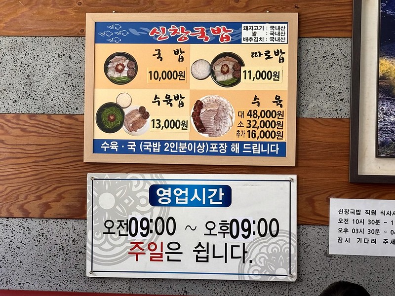 新昌湯飯本店於一九六九年創業、算一算居然跟我同年紀、早上十一點左右抵達、店內約有五、六成的客人、吃飽離開時、顧客已經接近八成滿、看得出來多半是釜山當地人。據友人表示、不少在附近罐頭市場工作或採買的人、都會選擇來這裡用餐、就連許多政商名流大老闆都曾是這的座上賓、在這一帶可算是名店來著。據說這家店是許多韓國大企業老闆成名前常來的早餐店、之後也曾不止一次帶媒體、朋友來用餐、店裡甚至有一排椅子背面刻著名人的名字、有別於一般簽名板、相當有意思、據說韓國三星老闆的名字也有在某張椅子上。這家店跟很多韓國的食堂一樣專賣一味、招牌就是豬肉湯飯、共有三種選擇、單純的豬肉湯是一萬韓元、加白飯是一萬一千韓元、乾濕分離加白飯則是一萬三千韓元、當然豬肉、血腸、豬肚的併盤也可以加量。