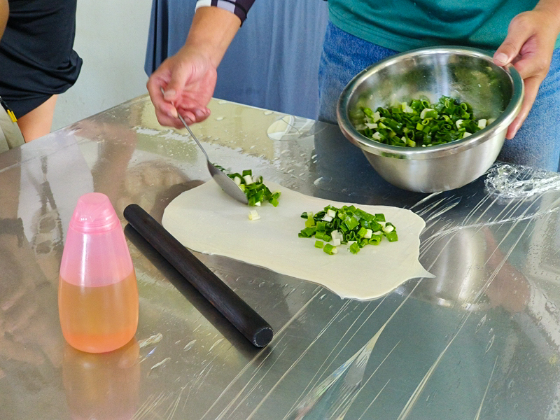 在「一日製茶師」的活動中,大家會跟著老師傅學著辨別什麼是「一芯二葉」,大家都玩得非常開心。茶葉最嫩的部分當然要小心地採摘下來。這真的是一幅很舒心的農村風情畫啊,只可惜現在因為人力比較短缺,大部分都已經是用機器來採摘了。從竹蔞裡拿出剛採摘下來最新鮮的茶葉,接著就進入了製茶的流程。因為是現場製作,所以大概就是炒茶、揉茶、烘茶這三個步驟。其實茶葉的製作過程都有很嚴謹的工序,當然啦,這裡主要是現場體驗,所以過程會簡化不少,重點就是讓大家體會那份得來不易的甘甜成果。在小火慢慢烘焙的過程中,會傳出陣陣迷人的茶香。接下來就是揉茶的步驟,讓茶葉的外型慢慢形成。然後,我們會將揉捻過的茶葉用熱風進行乾燥,把含水量降低到百分之三以下,這樣就可以讓保存期限延長到半年了。這樣就完成了從採茶到製茶的整個過程。大家活動了一下,接下來就可以準備休息,享受喝茶吃茶點的時光了。這裡會準備一壺熱茶、冷泡茶,還有簡單的茶食。大家可以坐在一起,喝茶、聊天,享受一個超級放鬆的下午。接著就是我們「一日蔥農」的體驗了,在「星寶農場」這裡。三星蔥已經是宜蘭非常有代表性的農作物了。這次來就是要採三星蔥、做三星蔥派,體驗當個「一日蔥農」。