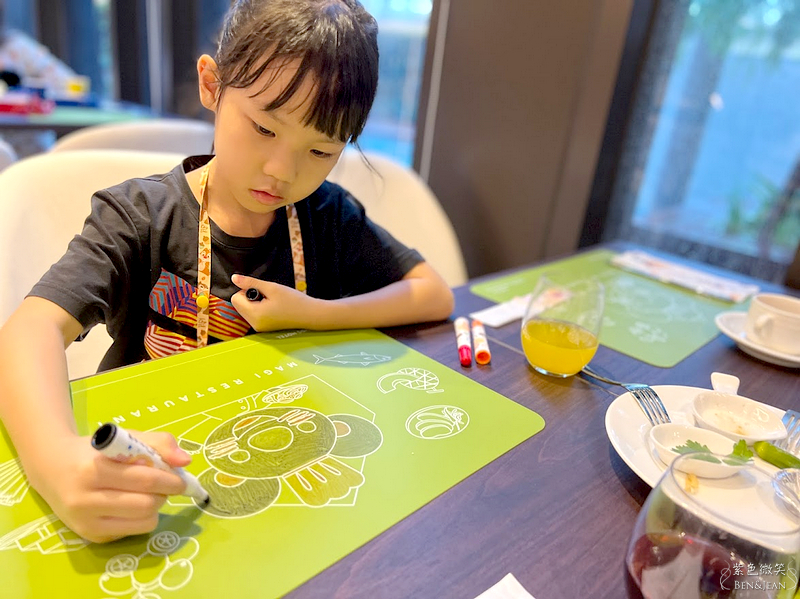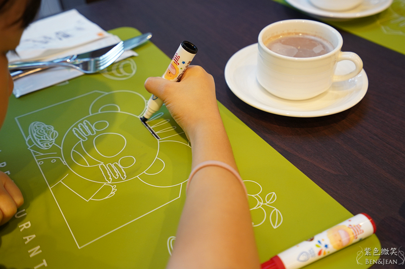 餐墊的設計也很棒,一旁還附有彩色筆! 小孩就是愛塗鴨!! 可以滿足小孩哦