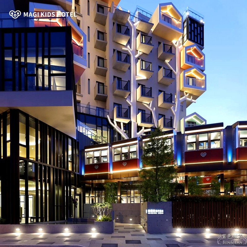 這間飯店精心規劃了總面積350坪的室內遊樂天堂,這裡擁有40多部的電動汽車,還有超過200公尺長的環狀汽車軌道,以及超過兩層樓高的溜滑梯,同時也設置了分齡的遊戲空間,透過親子DIY與精心設計的遊戲,讓親子可以留下親密互動的美好回憶。建築外觀的設計結合了在地林業文化,以儲木池、積木堆疊、復古童玩火車、樹屋祕密基地為設計主軸,這種文化與童趣交織的繽紛外觀,吸睛度極高,已經成為當地的特色地標,不論是白天或夜晚都呈現出不同的美麗風情。