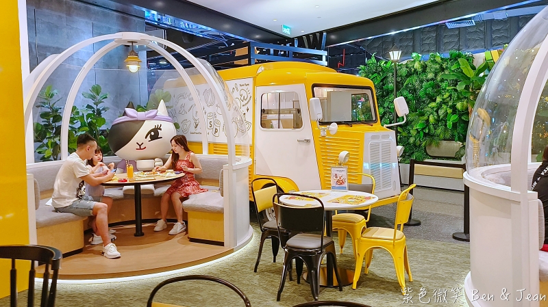 Brown & Friends CAFE & BISTRO位於澳門葡京人H853 Fun Factory娛樂廠的2樓,可以搭乘計程車、接駁巴士或從澳門主要碼頭與機場轉車前往,娛樂場內也設有停車場,交通非常方便,這間看似小小的餐廳卻隱藏了幾個不同設計概念的專區,這裡設有透明帳篷包廂座和輕食外帶的露營餐車,很有豪華露營風的感覺,還有一個區域匯集了披薩店、雜貨店、意式雪糕店等主題佈景,不僅提供餐飲,更是一個適合拍照的超萌空間,餐廳內外隨處可見熊大、兔兔、莎莉等11位LINE FRIENDS角色的公仔和壁畫,每個角落都精心佈置。
