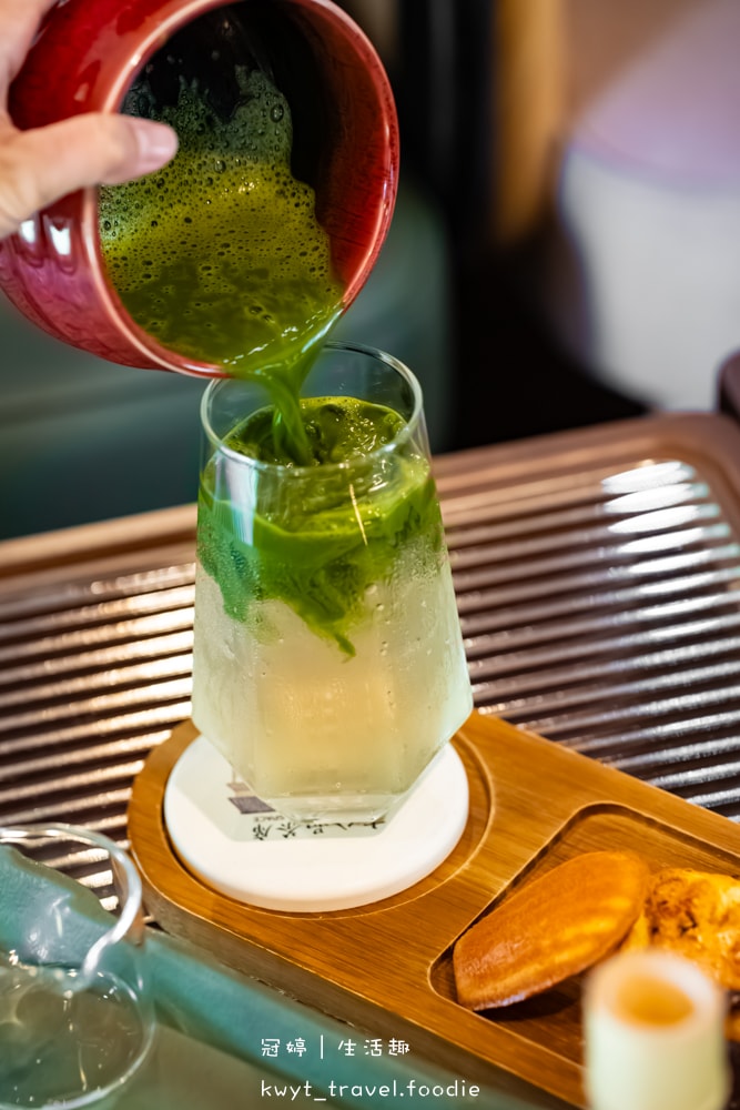 手刷到水與茶粉完美融合後倒入蘇打水中,即完成。