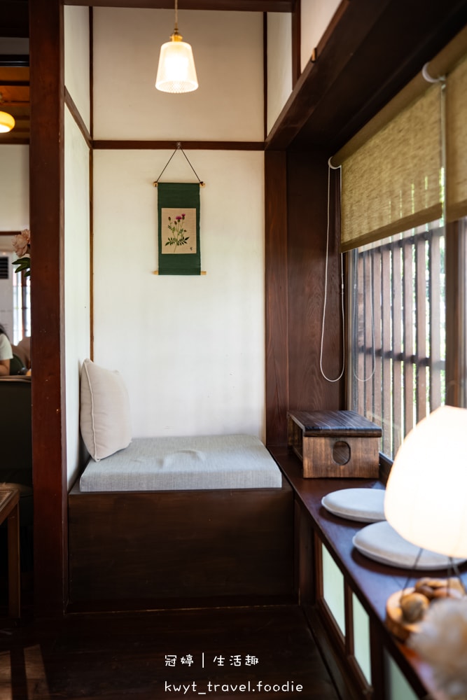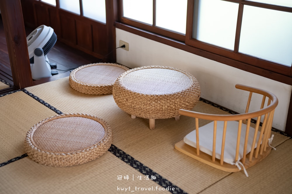 在保留木造結構、穀倉地板的日式古宅空間中,擺放幾張低矮的座椅、坐墊,適合小型工作坊、家庭聚會、抓周活動。