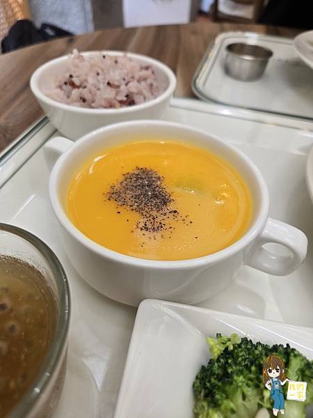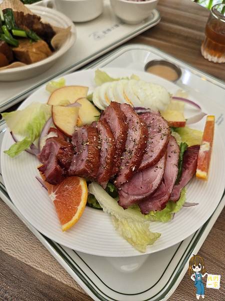 這裡的餐點也跟空間一樣充滿溫暖。像是古早味的焢肉飯套餐,焢肉滷得軟嫩入味,肥瘦剛好,滷汁又香濃不死鹹,真的會讓人想起小時候的味道。套餐還附紅茶、三樣小菜、湯跟甜點,湯是南瓜濃湯,甜點是山粉圓,吃起來很滿足又不會膩。另外還有鴨胸時蔬低卡沙拉,鴨胸烤得香噴噴的,搭配多種蔬菜,份量很夠卻沒有負擔,很開胃又很適合夏天。