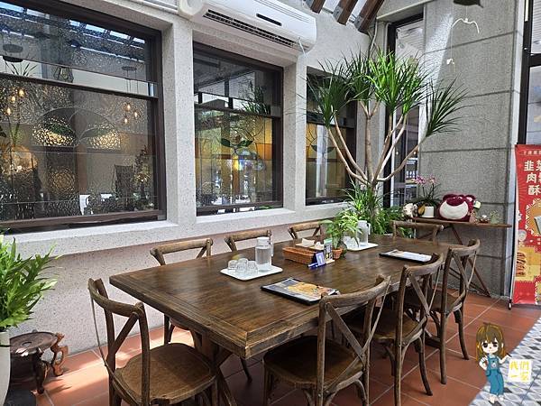 餐廳入口區,真的是讓人一進來就想放鬆。大片的落地玻璃窗,陽光暖暖的灑進來,照在木頭桌椅和綠色植物上,整個空間挑高又用了自然的顏色,感覺特別溫柔舒服,就像走進城市裡的綠色溫室一樣。窗邊的位子很推薦,光線斜斜的照進來,窗外的綠葉輕輕搖擺,連喝水都覺得特別療癒。座位之間距離很夠,不會擠也不會吵,不管是跟姐妹約會喝午茶,親子來個輕鬆的小旅行,甚至帶毛小孩來散步,都很適合。這裡就是那種讓人坐下來,就捨不得離開的好地方。