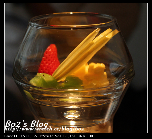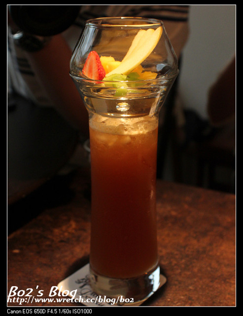 這水果冰茶這樣盛裝也太美了,雖然只是把杯子頂在水果茶上方,
