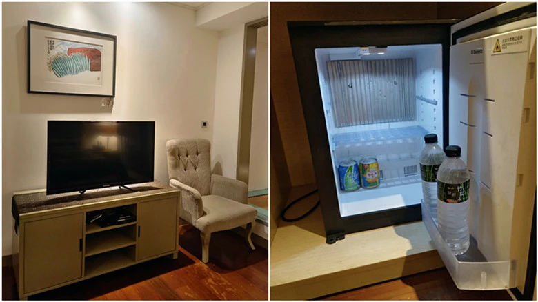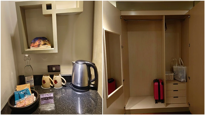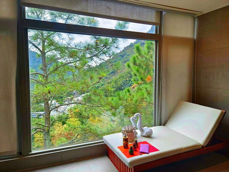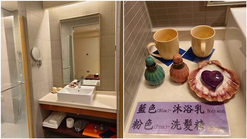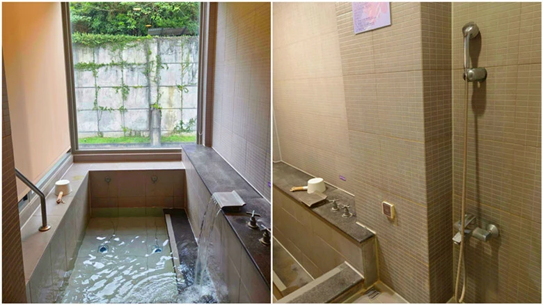 小冰箱上方除了礦泉水和茶包,還有貼心的迎賓小點心。衛浴空間採乾濕分離設計,廁所和洗手台皆在湯屋外,洗手台上備品精緻,沐浴乳和洗髮精為小瓷瓶裝,肥皂則是一顆紫色愛心造型。雙人房湯屋空間寬敞,泡湯池深度足夠,可容納兩人同時泡湯,淋浴蓮蓬頭就在旁邊,方便沖澡後直接入池享受溫泉。此外,工作人員也特別帶我們參觀了總統套房,該套房配有更大的和室、客廳和酒吧,房內湯屋設有落地窗,泡湯後可在躺椅上休息並欣賞風景,平日房價約為新台幣九千九百元。