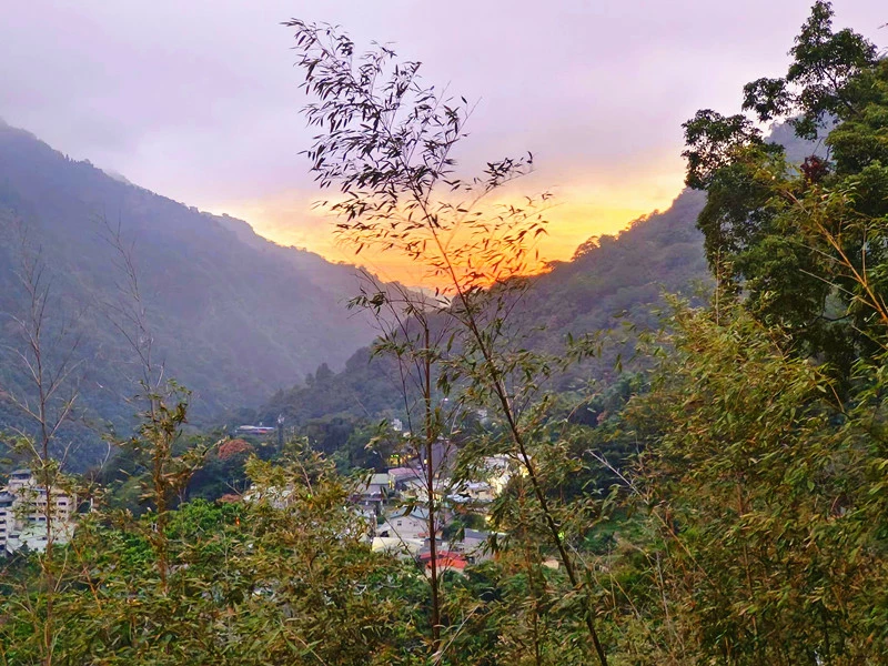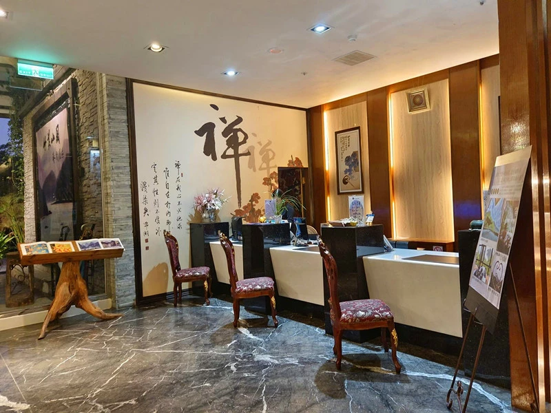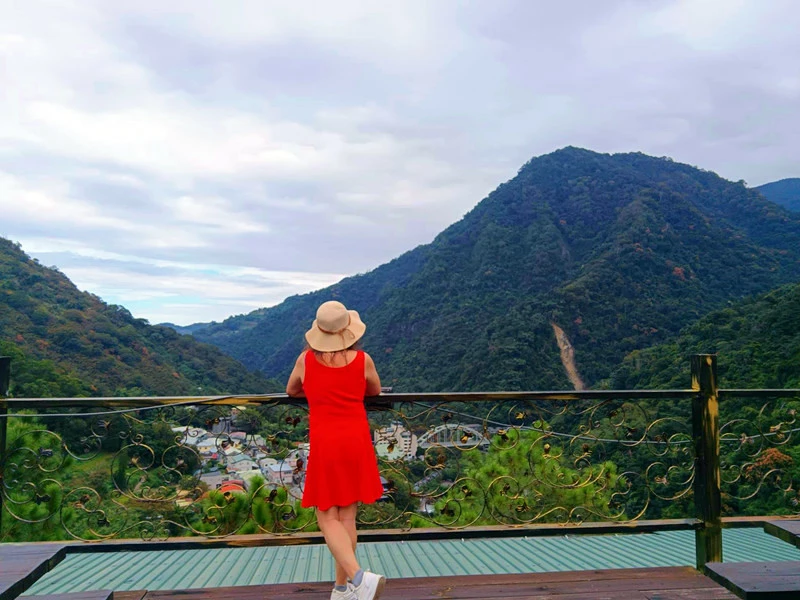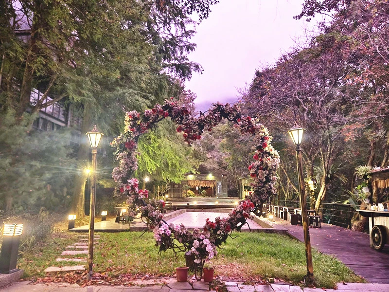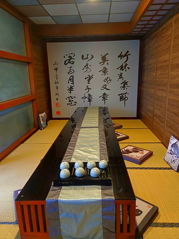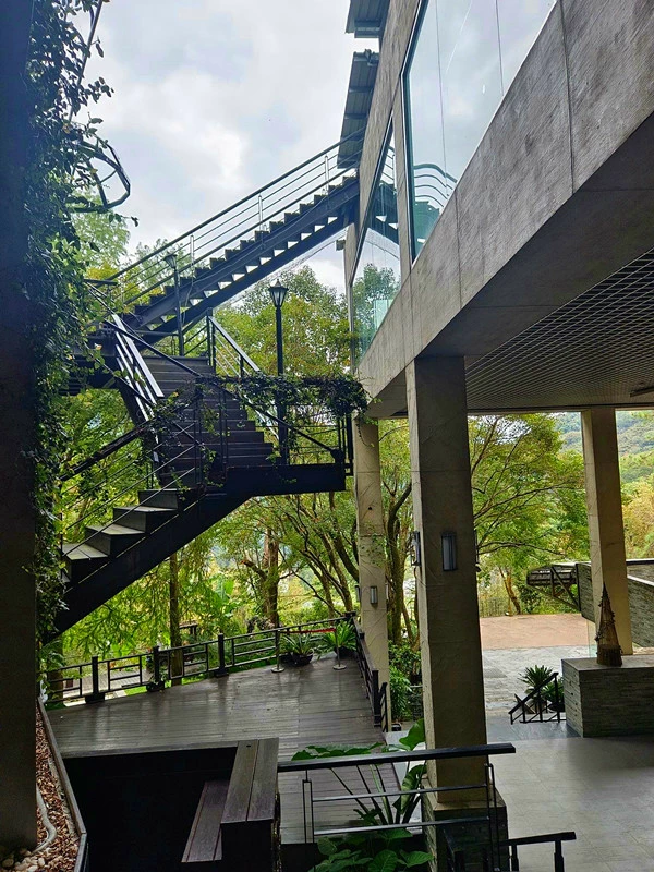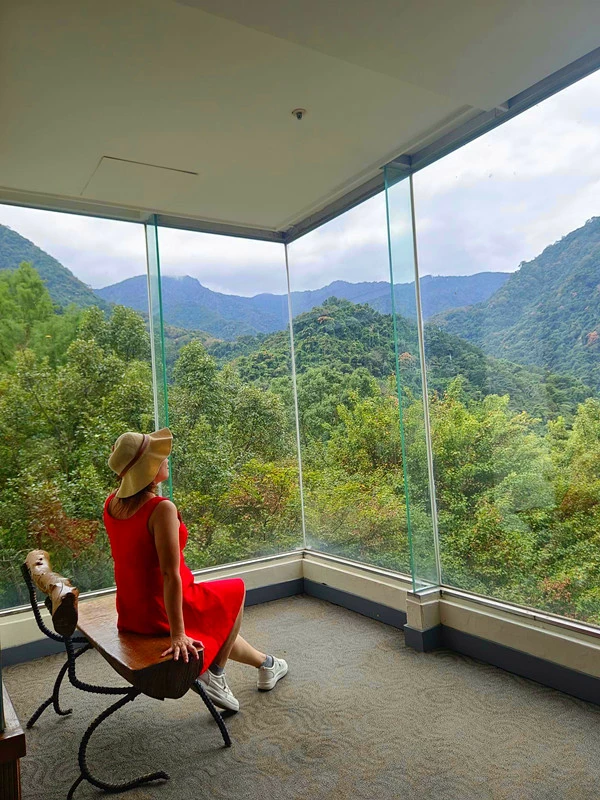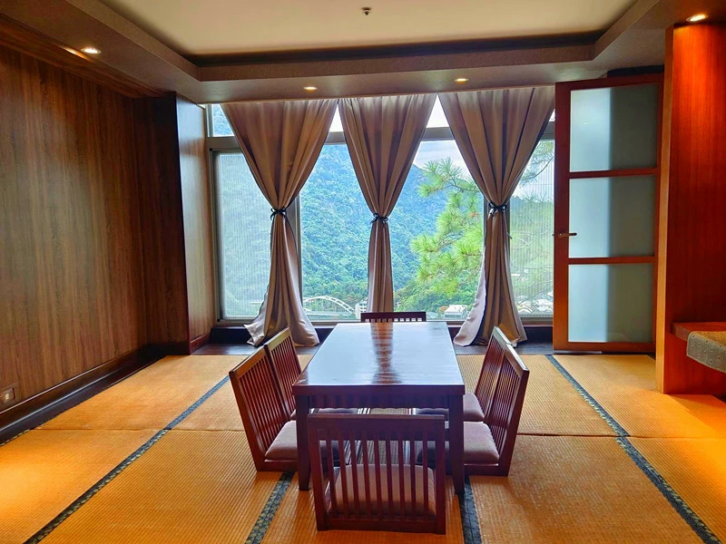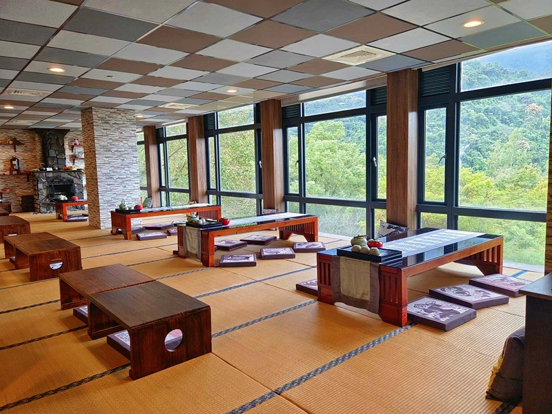 從頂樓視野毫無遮擋,可遠眺底下的民宅、溫泉旅館,以及泰安著名的龍安橋,景色宜人。另外,日式宴席茶屋則呈現道地的日式風情,窗邊落地窗採光良好,可將戶外山景盡收眼底。茶屋內設有VIP包廂,可容納約十人,座墊上亦是名家畫作。下午茶提供在地客家點心,如黑糖糕、綠豆糕和涼粉黑糖糕,口感甜而不膩。