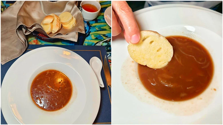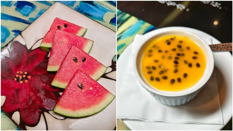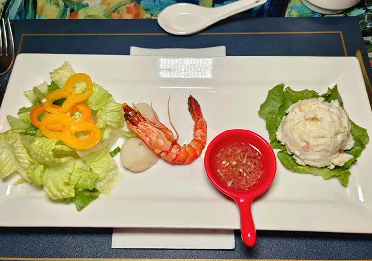 竹美山閣一泊三食的餐飲服務,包含早、晚餐及下午茶。由於會館周邊餐廳不多,在館內用餐非常方便,且其排餐每客新台幣六百元,價格合理。餐廳桌數可容納約五十至六十人,夜晚用餐氣氛柔和,每張餐桌上都擺放著名畫,展現藝術園區的特色。晚餐的西式晚宴套餐前菜包含生菜沙拉、馬鈴薯泥沙拉、干貝及蝦子,口感開胃。洋蔥濃湯和大蒜麵包尤其美味,且麵包和濃湯皆可無限續點。主餐可從豬肋排、香煎鱸魚和烤半雞中三選一,烤肋排份量足夠,口感恰到好處,可搭配沾醬或香料鹽。香煎鱸魚則有兩大塊,口味清爽,可擠檸檬汁並搭配香料鹽。飯後甜點有西瓜和百香果奶酪,為晚餐畫下完美句點。