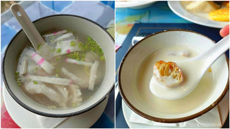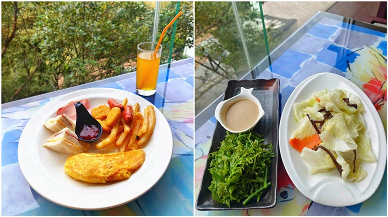 早餐提供中西式吃到飽模式,品項豐富且有特色。西式套餐包括歐姆蛋、培根薯條和美味的迷你三明治。中式早餐則有龍鬚菜沙拉、熱炒高麗菜、豬腳飯、香煎荷包蛋和蘿蔔糕,豬腿庫厚實不油膩,搭配酸菜口感清爽,所有餐點皆可無限續點。此外,還有海鮮粥和古早味杏仁茶,海鮮粥的配料豐富,杏仁茶味道純正,甚至能收服原本害怕杏仁味的人,據說這歸功於竹美山閣老闆娘對早餐品質的堅持,使得許多客人成為回頭客。