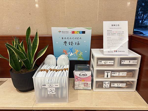 為了永續環保,飯店已不再提供一次性備品,若有需要可至1樓櫃台購買,所得將全數捐贈於「中華民國唐氏症基金會」。