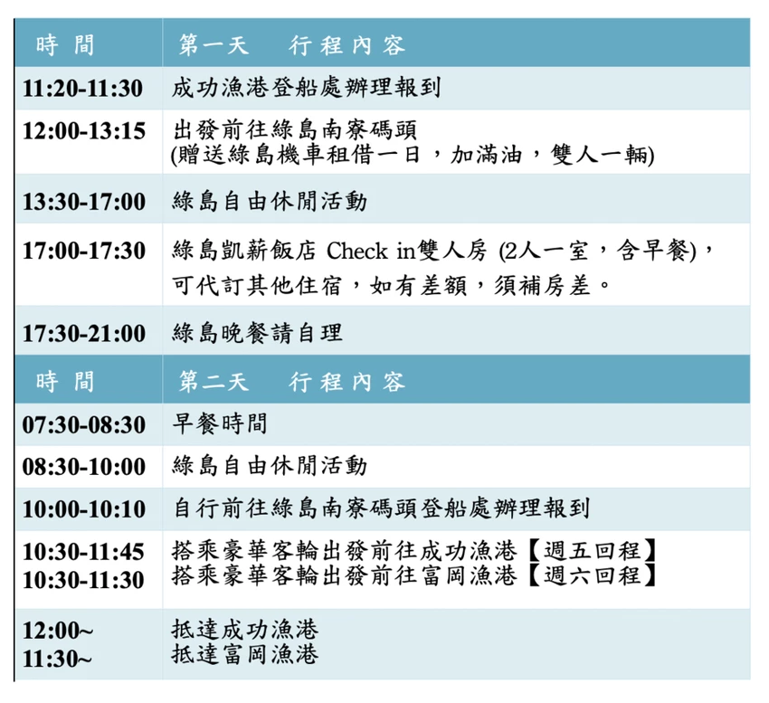 Michell 此次,就是挑選了參加「綠島二天一夜輕旅行」,規劃行程如下: