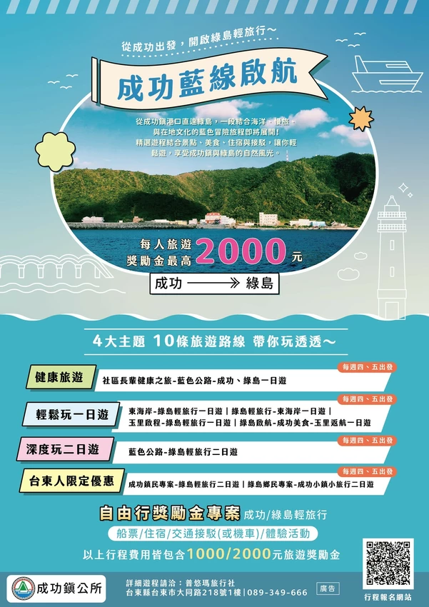 台東縣成功鎮公所爭取的「成功到綠島」航線,對北部來的遊客,在成功的新港漁港坐船往回綠島,就不必再多開車1個多小時到台東市富岡漁港搭船到綠島,變的更加方便了。