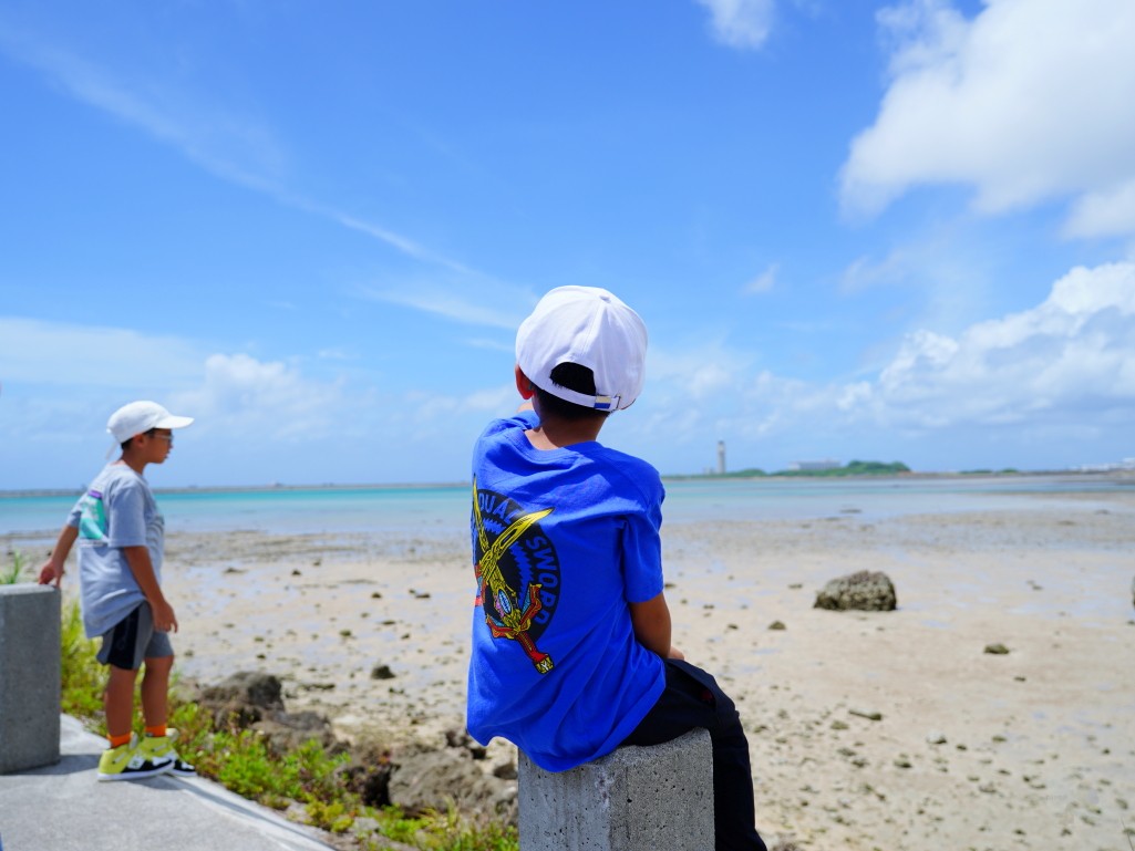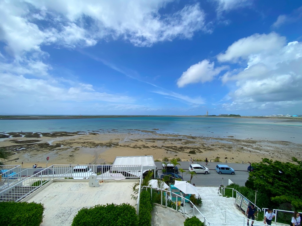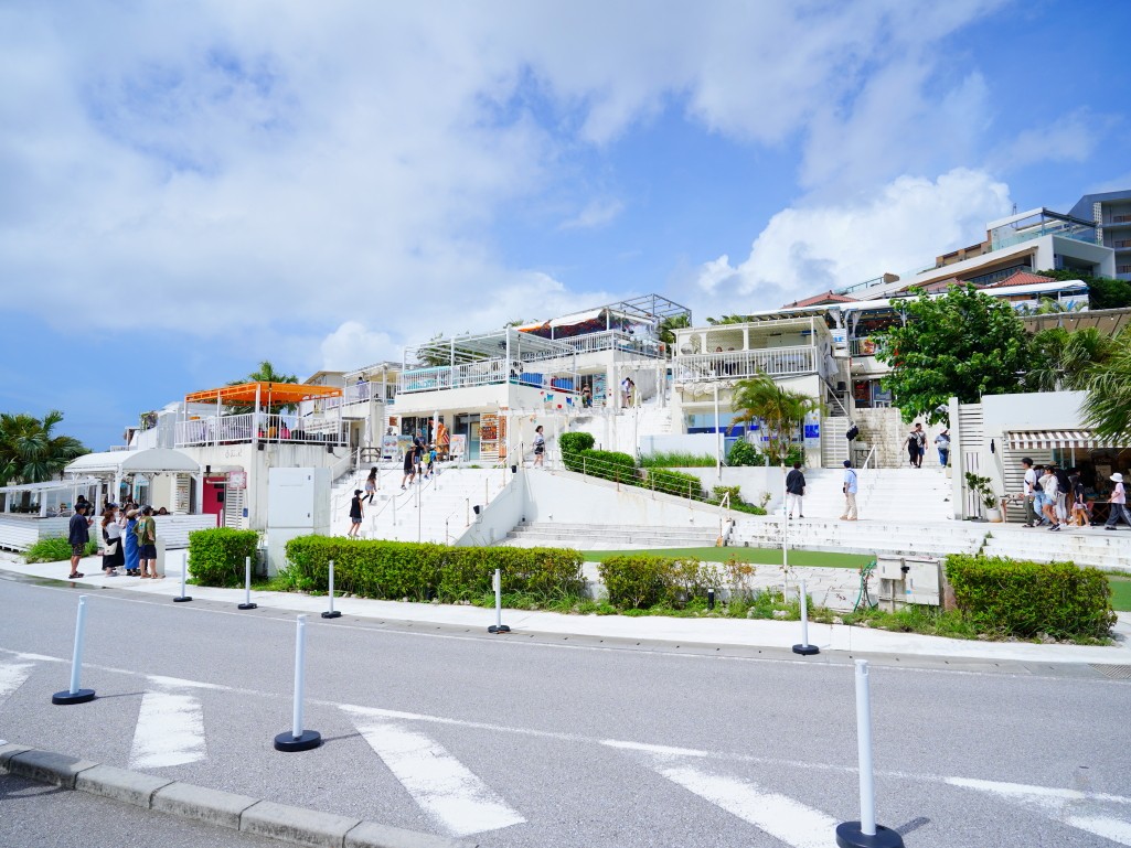 從上面往海邊看下去,景色真的超級美!白色的建築一路延伸到海岸邊,搭配藍天白雲和湛藍大海,完全就是沖繩才有的夢幻畫面~站在高處往下拍,不管是全景還是背影照,都美到不行,超級適合拍照打卡!