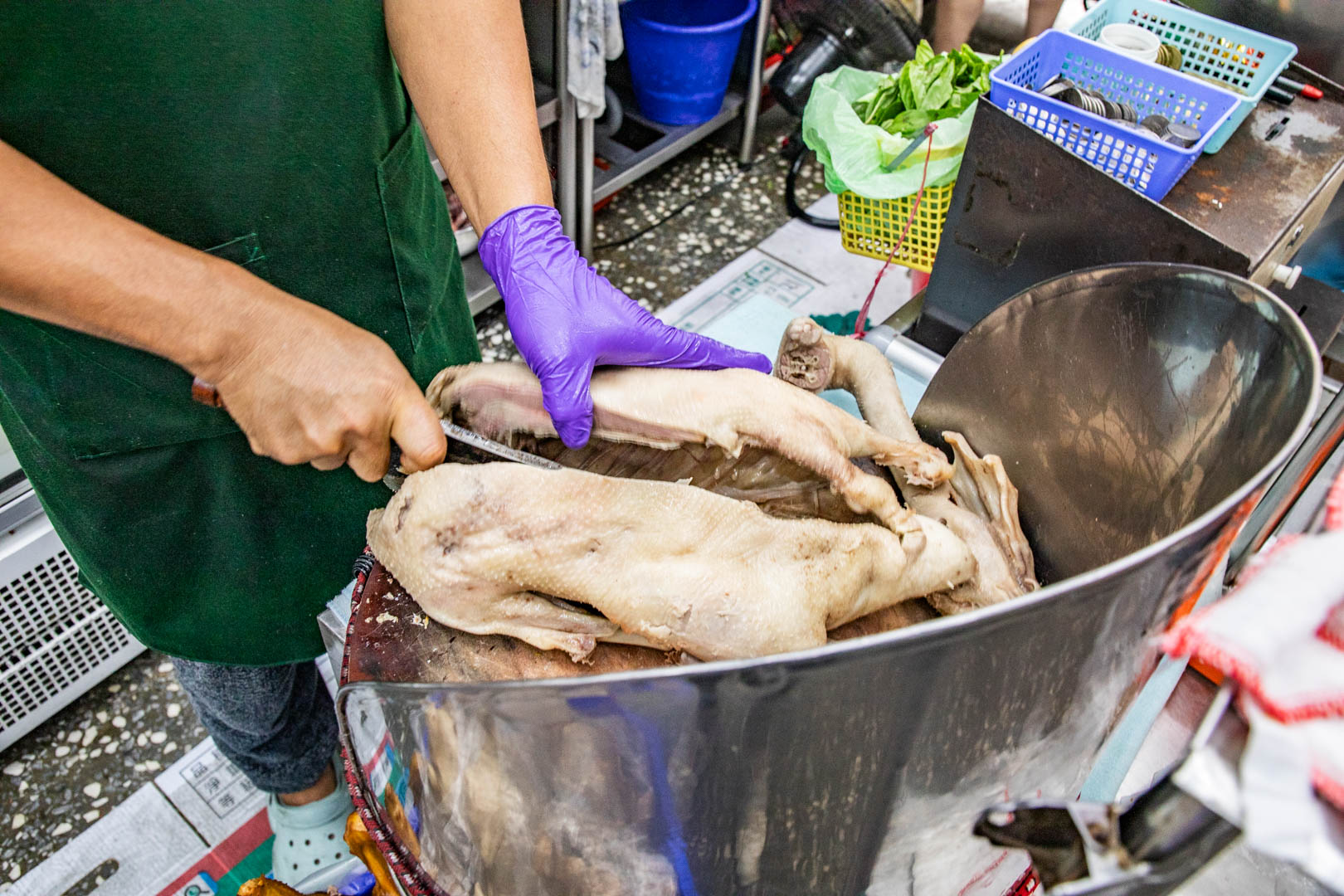 鵝媽媽鵝肉切仔麵的新家位在台北市文山區景後街129號1樓,電話是0981 089 096,營業時間從中午12點到晚上10點半,很適合午晚餐時段光顧。店址就在景美夜市旁邊,從捷運景美站走過來大約只要7分鐘,非常方便,開車來的話,景美國小也有收費停車場可以利用。新店面看起來明亮寬敞,座位也比以前多,店裡前面是料理區,後面才是舒適的座位區,騎樓也擺了兩張桌子,牆上還有米其林推薦的貼紙,證明了它的實力。每天現場都能看到老闆俐落地剁著鵝肉,鵝肉是每日限量販售,賣完就沒有了,想吃真的要趁早。