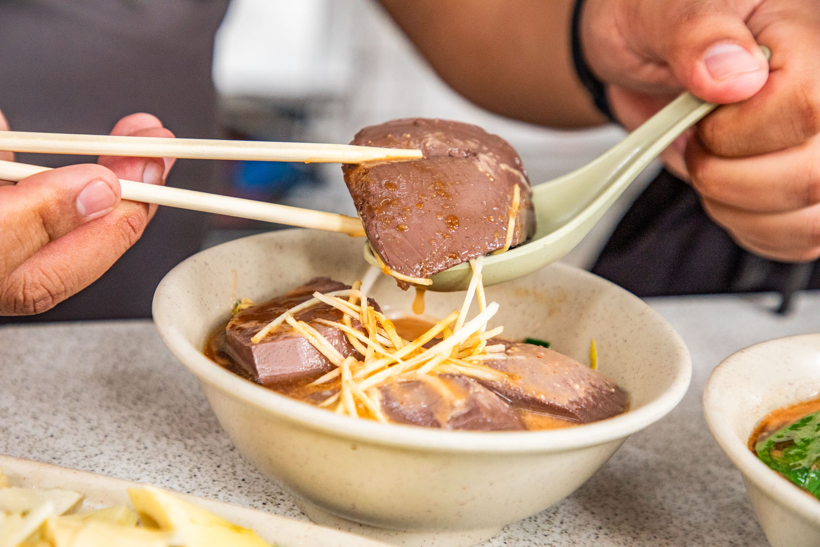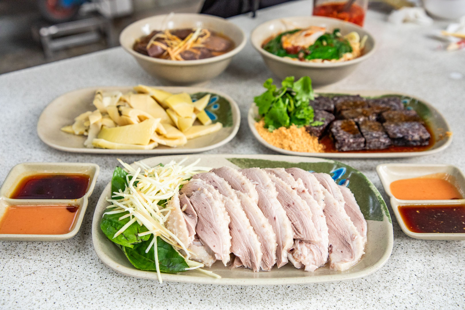 白切鵝絕對是鵝媽媽鵝肉切仔麵的必點招牌,就是靠這道菜才拿下米其林餐盤推薦,老闆的刀工真的非常厲害。我們點的是鵝胸前段,老闆會將肉片得很薄,擺盤像扇子一樣,非常精緻。鵝肉吃起來香甜美味,肉汁完全鎖在裡面,尾韻還有高湯的濕潤感和回甘,帶點微鹹的滋味讓鵝肉更加鮮甜,不沾醬就已經很好吃了,雖然店家有提供甜辣醬和蒜蓉醬,但我覺得原味就很棒。乾的切仔麵也是許多人的選擇,淋上醬汁後,味道有點像甜辣醬再加點蒜泥,麵條Q彈,醬汁濃稠還有油蔥香,吃起來很涮嘴,麵裡還附了一片白切五花肉。乾鴨血一份45元卻給得超大塊,切成四等份,非常厚實而且完全入味,沒有腥味,醬汁還有蒜香,是必點小菜。桂竹筍感覺是用鵝高湯煮的,口味清爽,帶點鹹酸,吃起來不會太軟,厚實的地方還能吃到脆度。米血是乾的,除了川燙淋醬油膏,鵝媽媽鵝肉切仔麵還附了花生粉和香菜,吃起來很像外面賣的豬血糕,但米血更軟嫩,也很好吃。總之,鵝媽媽鵝肉切仔麵的鵝肉鮮嫩多汁,口感細膩,鮮美的滋味真的會讓人一試成主顧,而且價格非常親民,不僅滿足了味蕾,也帶來了物超所值的用餐體驗,這也是為什麼它能獲得米其林餐盤推薦的原因,絕對是鵝肉愛好者值得一再光顧的好店。