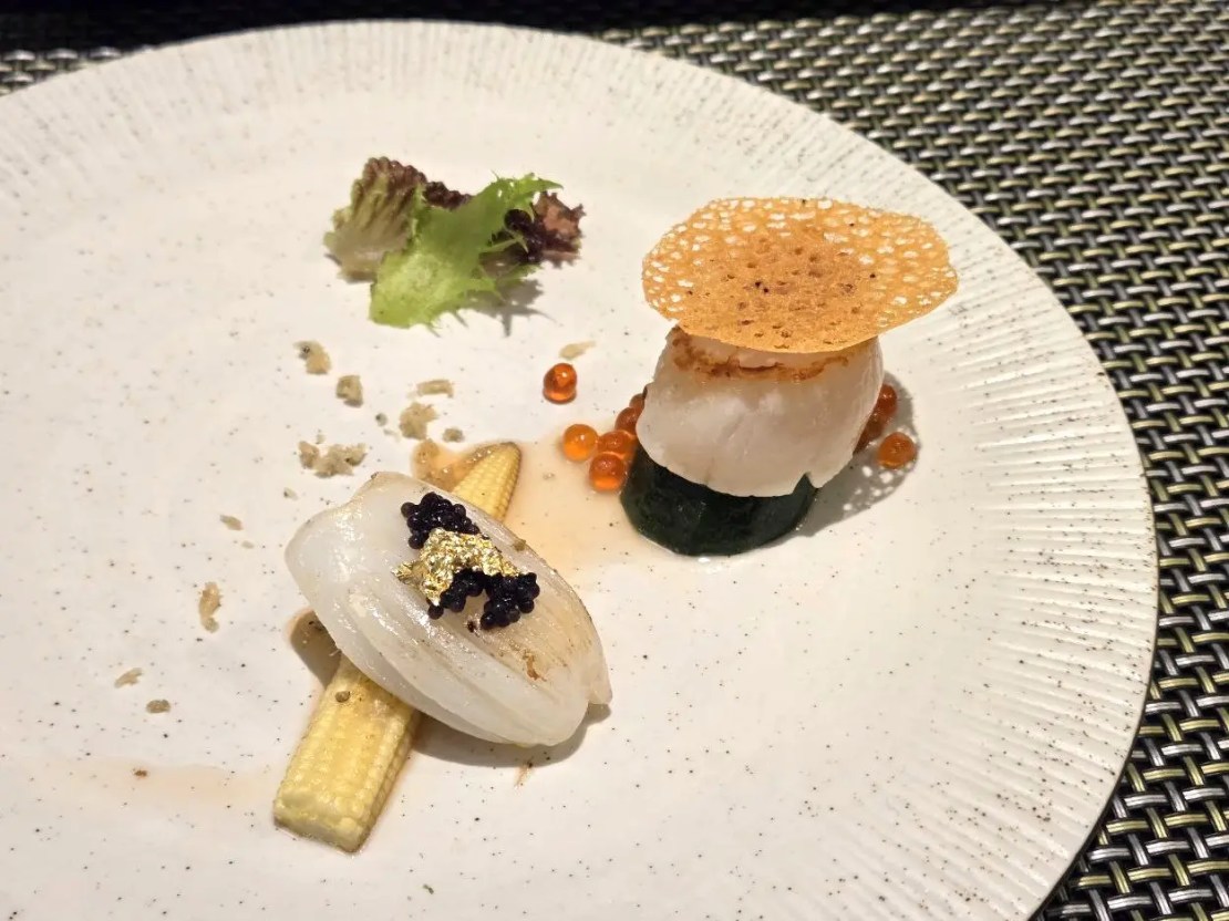 北海道干貝搭配花枝與魚子醬,干貝煎得外微焦內嫩,花枝切得細緻,口感Q彈,魚子醬則增添了鹹香與層次。整道菜的擺盤也很精緻,像是一幅海洋風味的藝術品,吃起來既有視覺享受也有味覺驚喜,海味層層堆疊,令人回味。
