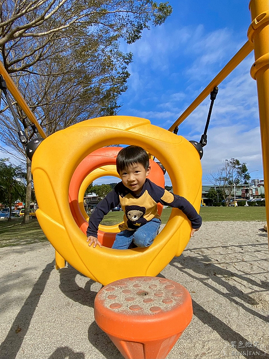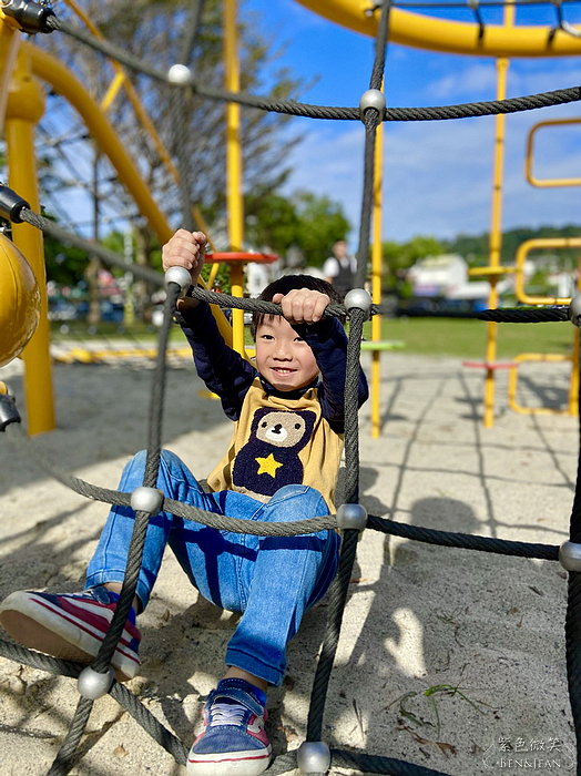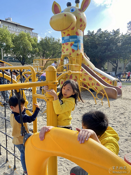 這個長頸鹿親子公園的主體大約有6米高,它四周結合了溜滑梯、攀爬網還有單槓等設計,就像八爪章魚一樣,上面常常可以看到滿滿的小朋友,真的很厲害。可愛的長頸鹿四邊短腿造型都不一樣,有的是溜滑梯,有的是攀爬網、攀岩石等,每處都有巧妙的安排,讓大小朋友都能找到自己喜歡玩的角落。公園的地上是沙坑,萬一不小心掉下來也有緩衝,就連比較小的孩童都能玩得很開心,各式各樣的攀爬網讓孩子們可以動動身體,也能動動腦去駕馭它,送孩子們來這裡放電,晚上一定可以睡得很好。長頸鹿旁邊還有一些公園基本設施,例如搖椅、單槓跟體健設施等,大人跟老人家也能趁機一起動一動,因為孩子們常常一玩就是很久、很久。