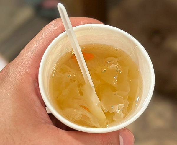 招牌必點的「韓式泡菜雞腿石鍋拌飯」是熱騰騰的石鍋飯,上面鋪有煎烤的雞腿肉片及滿滿的豬肉片。拌勻後享用,米飯帶有脆脆的鍋巴感,整體口感豐富,鹹香帶辣,份量十足,讓人吃得很過癮。餐後甜點提供白木耳甜湯,小小一杯,溫熱微甜又滑順,作為飯後甜點非常合適。