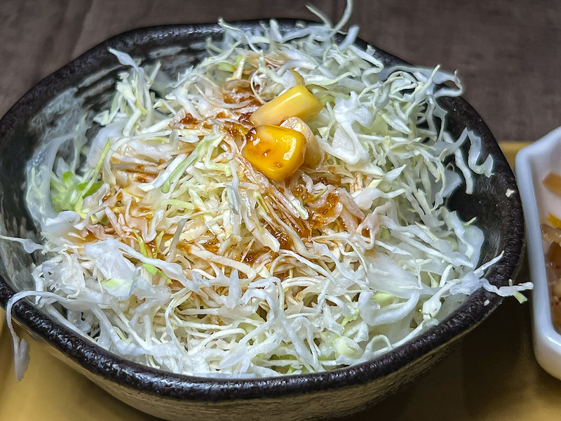 但其主打的腰內豬排,份量相當大,尺寸足可與許多名店媲美。炸衣瀝油處理得當,肉質確實相當鬆軟,從斷面可見肉有經過拍打處理,這是一種料理手法。整體而言,這份豬排的口感與風味達到中上水準,沾點醬汁更是美味。