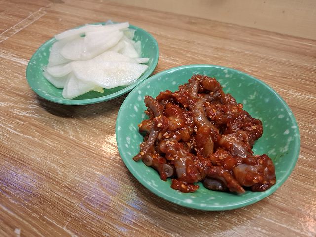 在餐點方面,店家首先送上的小菜便令人驚艷。其中,「辣醃魷魚」深受喜愛。這道小菜的魷魚切得細緻,口感脆中帶韌,醬汁鹹香帶辣,並帶有一點微甜,非常下飯。另一道「柚香蘿蔔」則以其清爽解膩的風味獨具特色。蘿蔔切得大小適中,咬下去多汁且帶有柚子的果香,味道不過酸也不過甜,很適合搭配主餐食用。