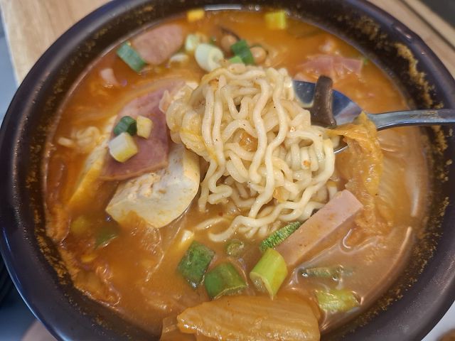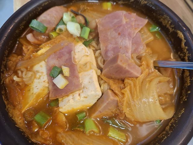 經典的韓式料理「部隊鍋」在這裡也備受推薦。這道熱騰騰的鍋物上桌時,尤其在寒冷的夜晚享用,會讓人感到格外過癮。其湯頭夠味但不死鹹,帶有濃郁的泡菜香和微辣感,而且鍋中配料非常豐富,一鍋吃下來令人感到超滿足。鍋裡的泡麵口感適中,湯頭喝起來順口,整體吃起來暖胃且充滿飽足感。