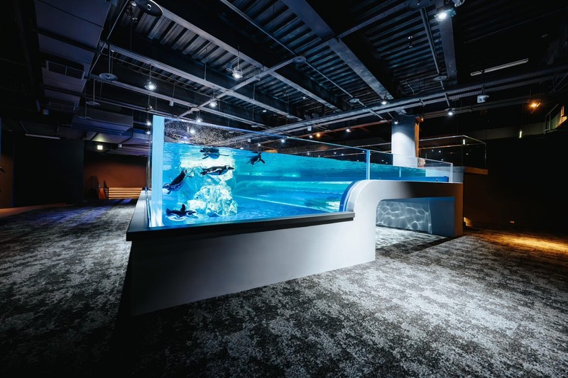 台中海洋館以「從台中河川,流向世界之海」為策展主軸,建築外觀宛如一顆巨大深色岩石,象徵水文生態自山川奔流至海港的意象。館內採全開放式設計,突破傳統隔著玻璃觀賞的模式,並規劃多處互動體驗區,讓遊客能近距離觀察企鵝、在涉水區與生態互動,或透過沉浸式投影感受海洋的壯闊。整體空間設計融入在地自然脈絡,結合多元展示效果與具故事性的參觀動線,帶領遊客化身為悠遊於洋流中的小魚,隨著水流流轉,開啟多重感官與視角,細細品味海洋世界的絕美風貌。