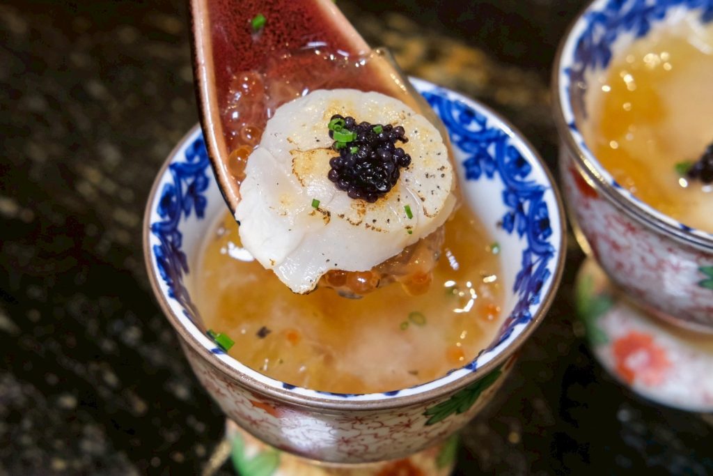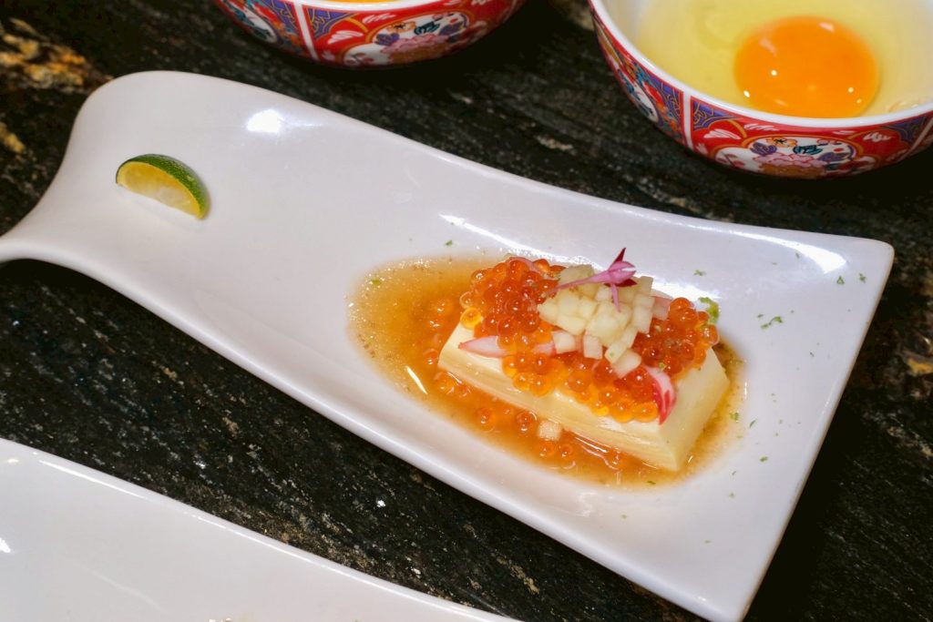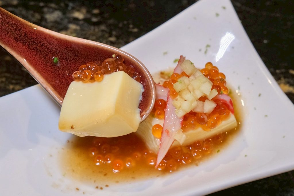 餐點部分可說是充滿驚喜,像是誘人的和風蟹肉鮭魚卵豆腐,鮭魚卵給得超有誠意,每一口都能吃到滿滿的魚卵。還有超特別的紀州梅愛玉干貝,滑嫩愛玉搭配彈牙干貝,創造出前所未有的新滋味,非常有創意。味噌湯雖然看似平凡,卻加入了豆腐丸子和腐竹,吸飽湯汁還會爆漿。
