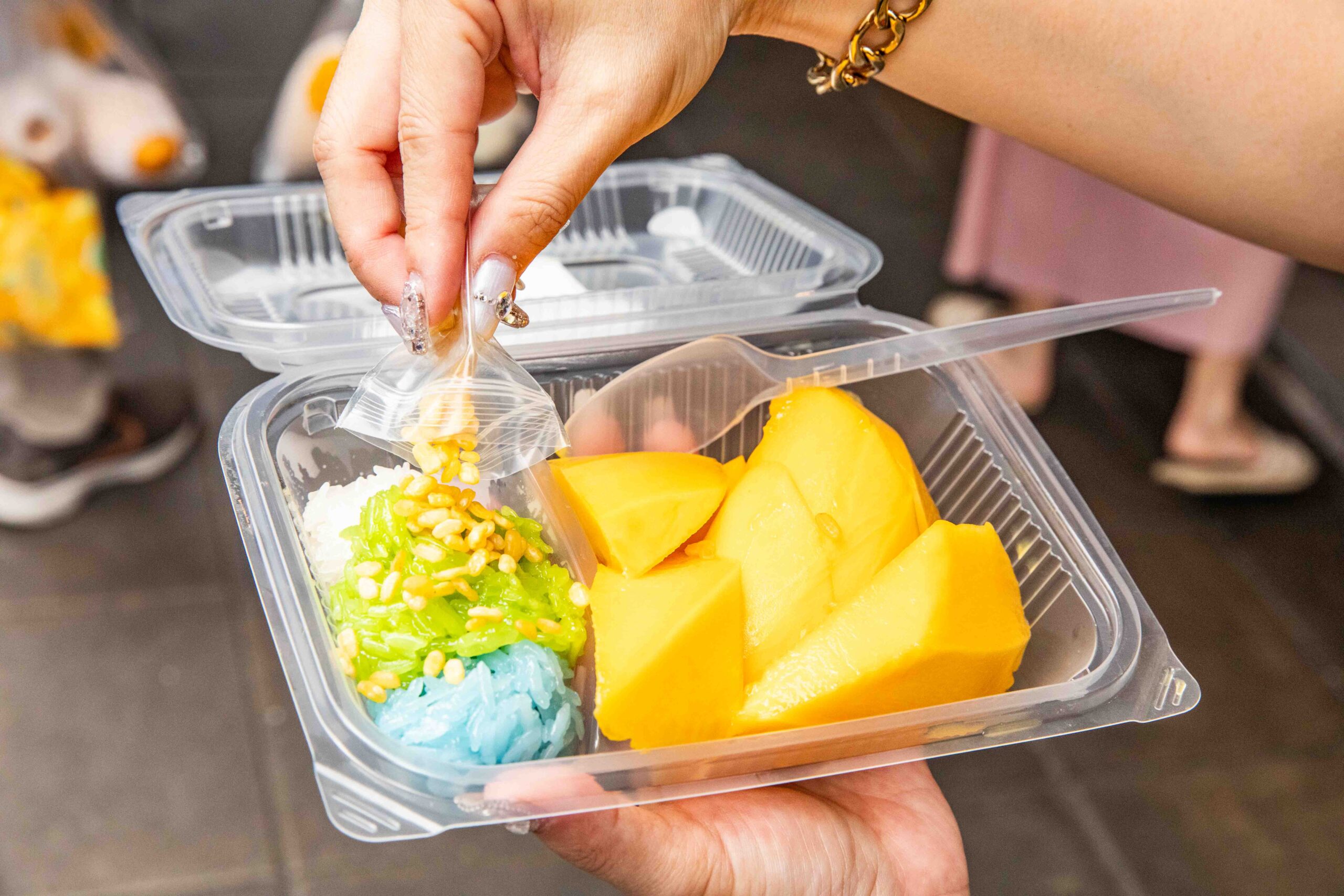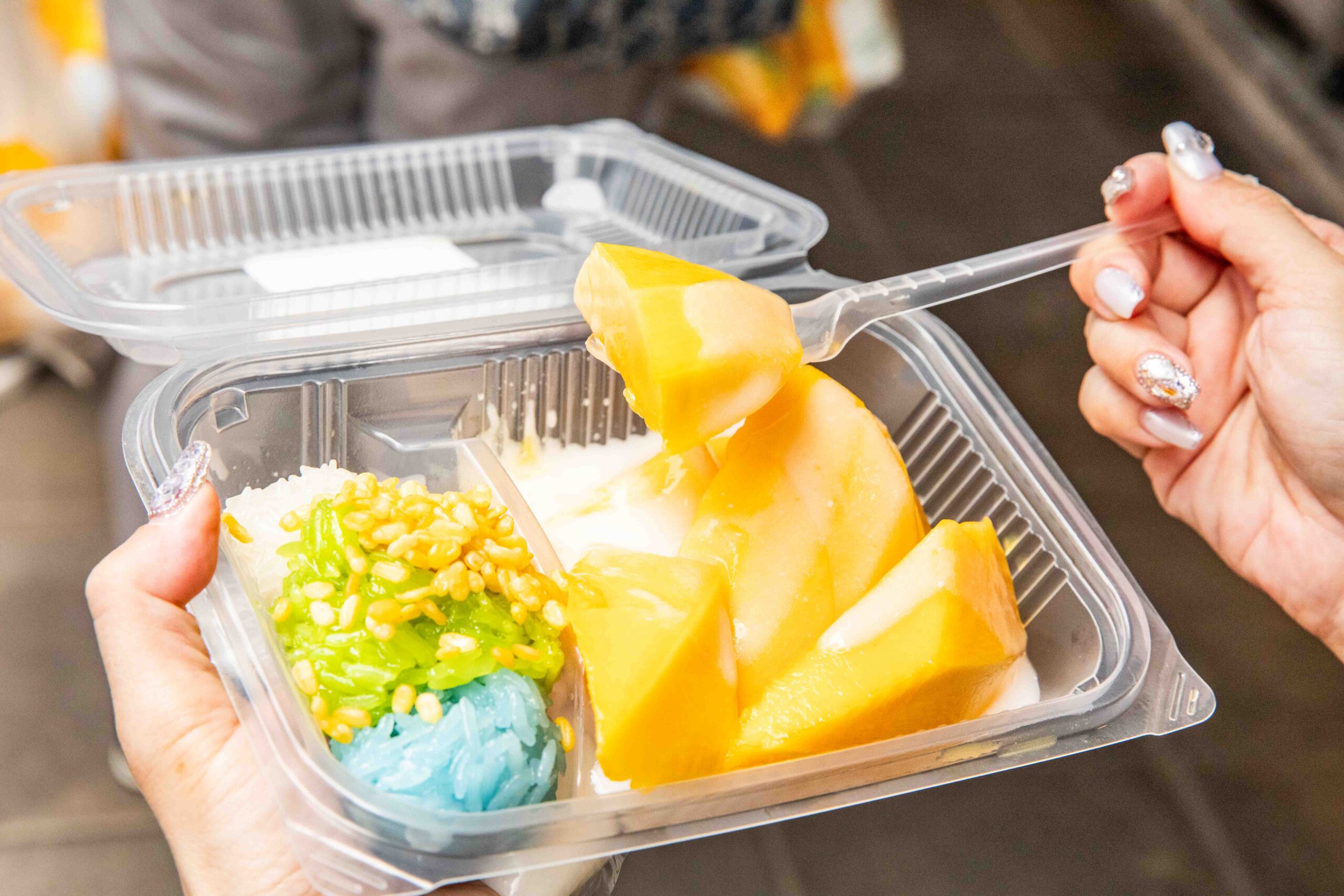 三色糯米飯分別是原味糯米、班蘭葉糯米跟紫米糯米,說實話,除了聞起來有一點點香氣,淋上椰漿後我其實吃不太出來它們個別的味道,但光是看它的賣相,這三種顏色搭配在一起就很容易讓人看了食慾大開,而且綠豆蒜也一定要加進去,這樣整個口感層次會更豐富、更明顯。芒果的果肉飽滿多汁,纖維也很細緻,單吃的話會偏甜,當它跟溫熱Q彈的糯米飯以及椰漿的鹹甜味道混合在一起時,那種平衡感真的是恰到好處,而且芒果吃進嘴裡後,尾韻還會帶有淡淡的香氣跟果酸味,真的會讓人越吃越上癮,吃完一盒我甚至還想再買一盒來吃。