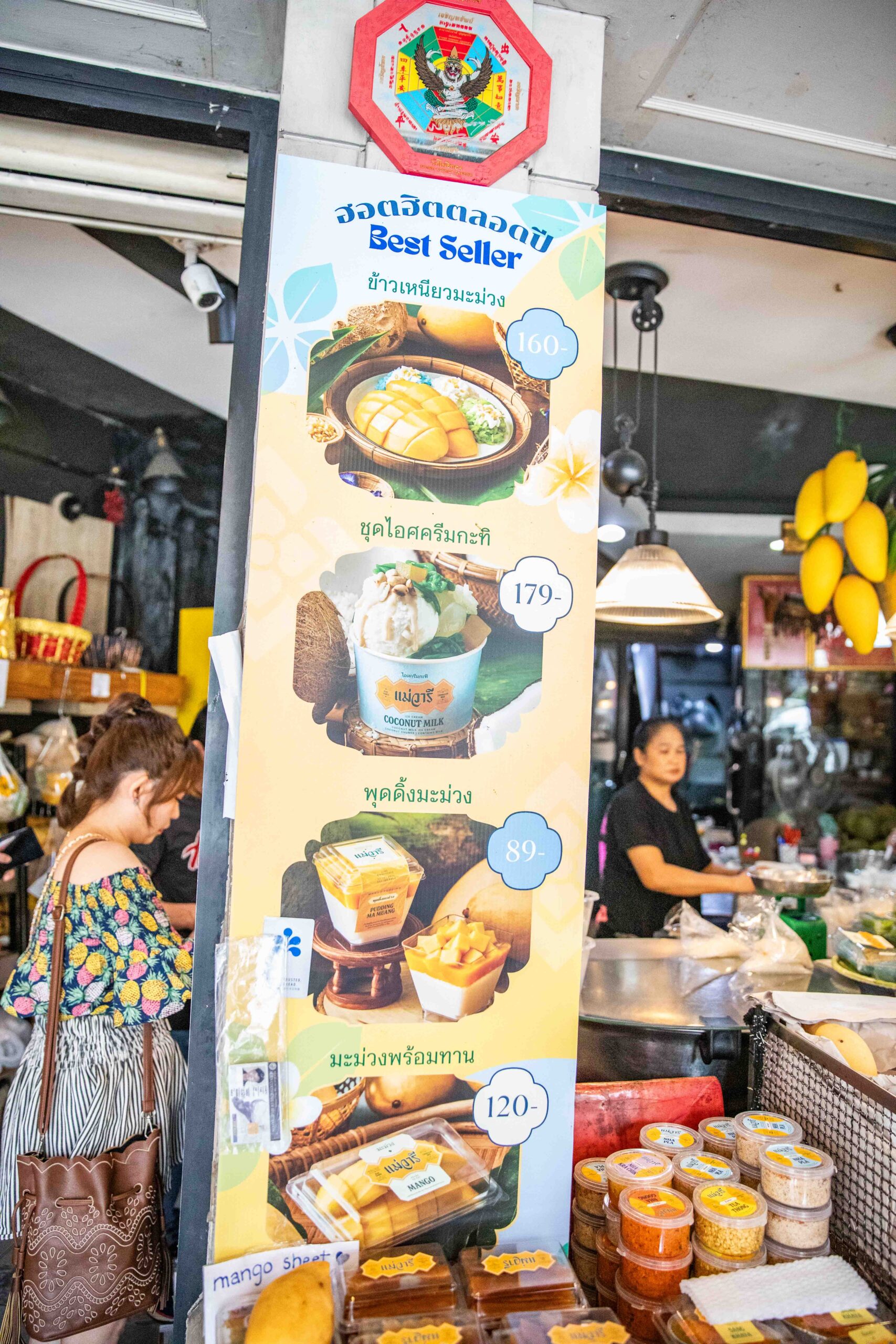 除了招牌的芒果糯米飯,Mae Varee也有販售整顆的芒果,他們使用的芒果品種應該是水仙芒,果皮呈現亮麗的金黃色,果肉細膩、纖維很少、甜度非常高,而且香氣濃郁,當然價格就不會太便宜,大概跟台灣愛文芒果的水準差不多。這裡除了賣芒果糯米飯,還有一些芒果果乾、水果乾跟泰式甜點,這些好像都是他們自家生產的。特別是芒果乾賣得非常好,尤其是馬來西亞的觀光客,常常一次就買到上千元。
