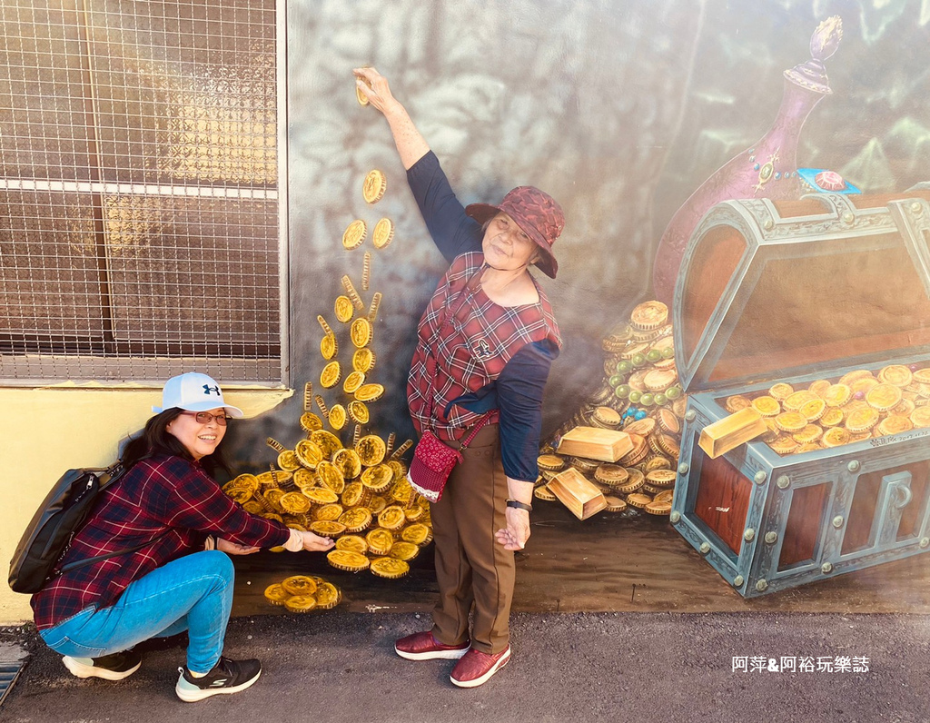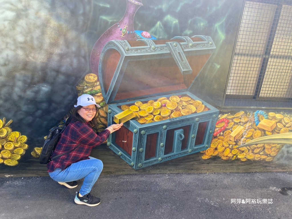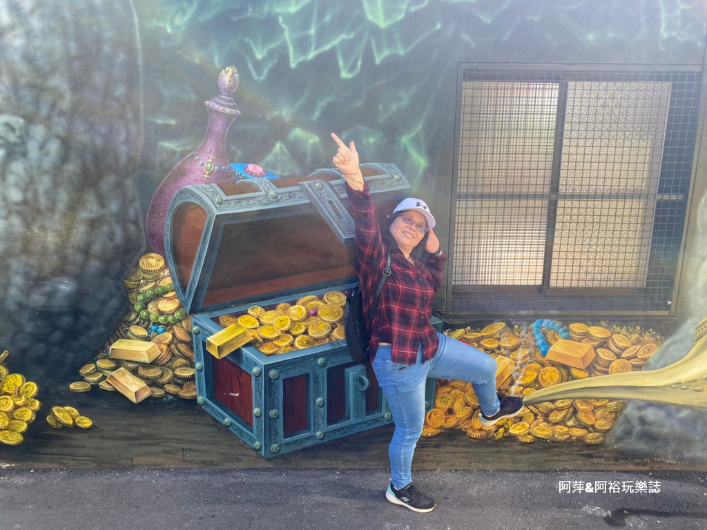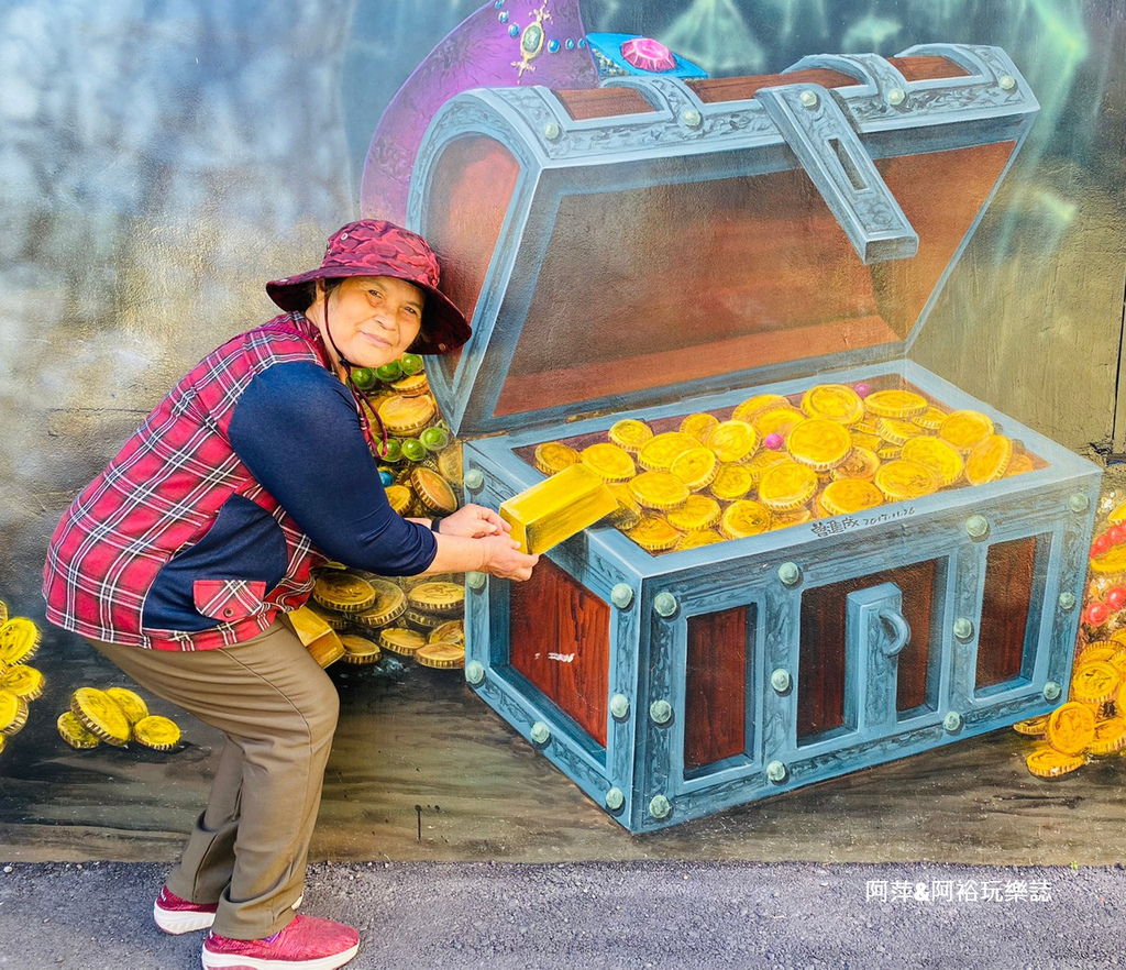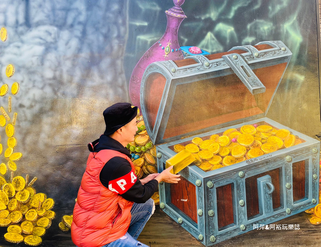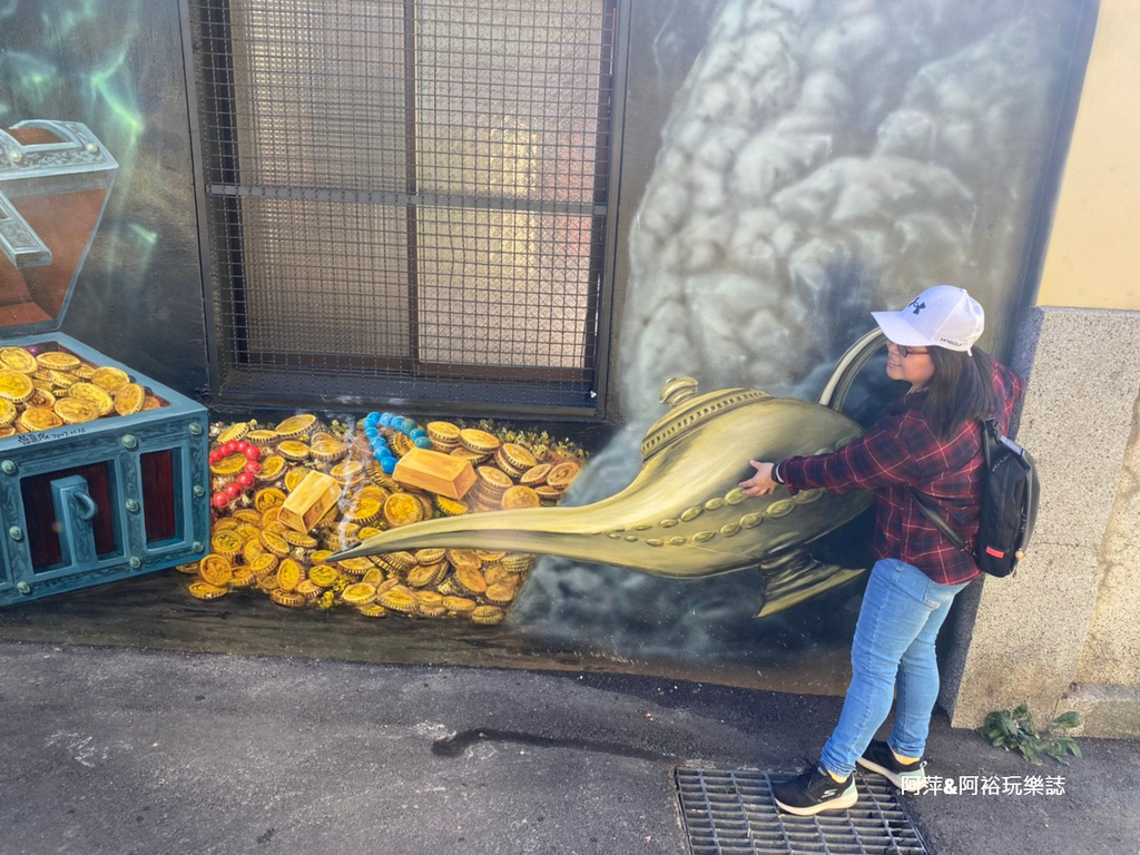走進這個彩繪村,你會看到許多耳熟能詳的童話世界場景喔,像是你可以幫忙擦亮阿拉丁神燈,想像著它會給你滿滿的金銀財寶,或是走進閃耀著金光的魔法寶藏盒,感受被金條金塊圍繞的富裕感。