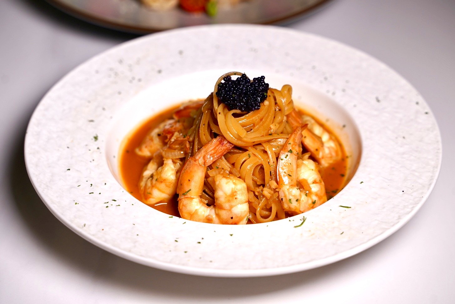 「濃厚鮮蝦義大利麵」光看這橘紅色的醬汁,就知道蝦味有多濃郁了!特別選用義大利細扁麵,讓麵條吸附滿滿的蝦醬,還擺上一整圈新鮮彈牙蝦子,超有誠意,最後再撒上魚卵點綴,每一口都是濃濃海味,完全停不下來~
